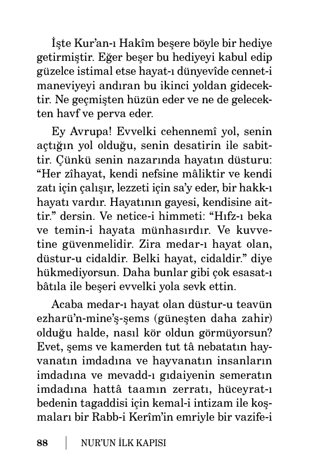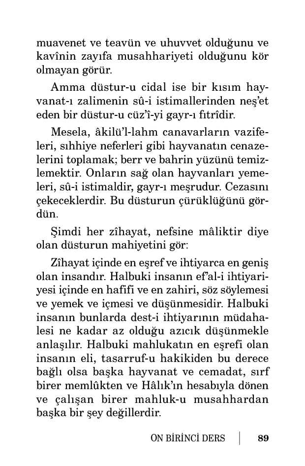 Zîhayat içinde en eşref ve ihtiyarca en geniş olan insandır. Halbuki insanın ef’al-i ihtiyariyesi içinde en hafifi ve en zahiri, söz söylemesi ve yemek ve içmesi ve düşünmesidir. Halbuki insanın bunlarda dest-i ihtiyarının müdahalesi ne kadar az olduğu azıcık düşünmekle anlaşılır. Halbuki mahlukatın en eşrefi olan insanın eli, tasarruf-u hakikiden bu derece bağlı olsa başka hayvanat ve cemadat, sırf birer memlûkten ve Hâlık’ın hesabıyla dönen ve çalışan birer mahluk-u musahhardan başka bir şey değillerdir.