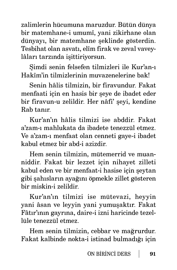 Hem senin tilmizin, mütemerrid ve muanniddir. Fakat bir lezzet için nihayet zilleti kabul eden ve bir menfaat-i hasise için şeytan gibi şahısların ayağını öpmekle zillet gösteren bir miskin-i zelildir.