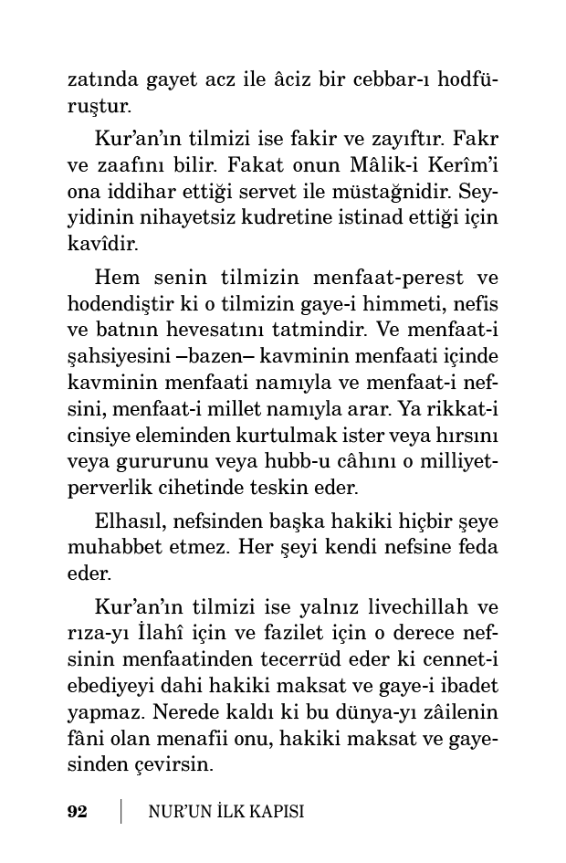 Bu iki tilmizin mürüvvetlerinin derece-i farkına bak ki: Senin tilmizin, nefsi için kardeşinden kaçar. Kur’an’ın tilmizi ise bütün ibadı, belki bütün mahlukatı kendine kardeş görür.