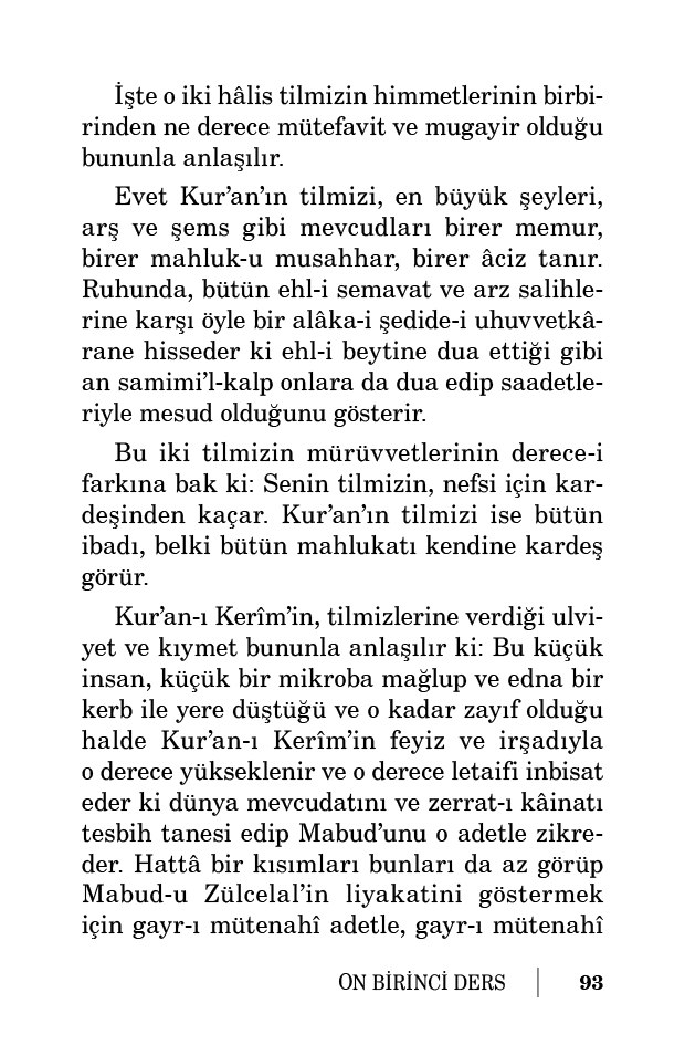 Kur’an-ı Kerîm’in, tilmizlerine verdiği ulviyet ve kıymet bununla anlaşılır ki: Bu küçük insan, küçük bir mikroba mağlup ve edna bir kerb ile yere düştüğü ve o kadar zayıf olduğu halde Kur’an-ı Kerîm’in feyiz ve irşadıyla o derece yükseklenir ve o derece letaifi inbisat eder ki dünya mevcudatını ve zerrat-ı kâinatı tesbih tanesi edip Mabud’unu o adetle zikreder. Hattâ bir kısımları bunları da az görüp Mabud-u Zülcelal’in liyakatini göstermek için gayr-ı mütenahî adetle, gayr-ı mütenahî