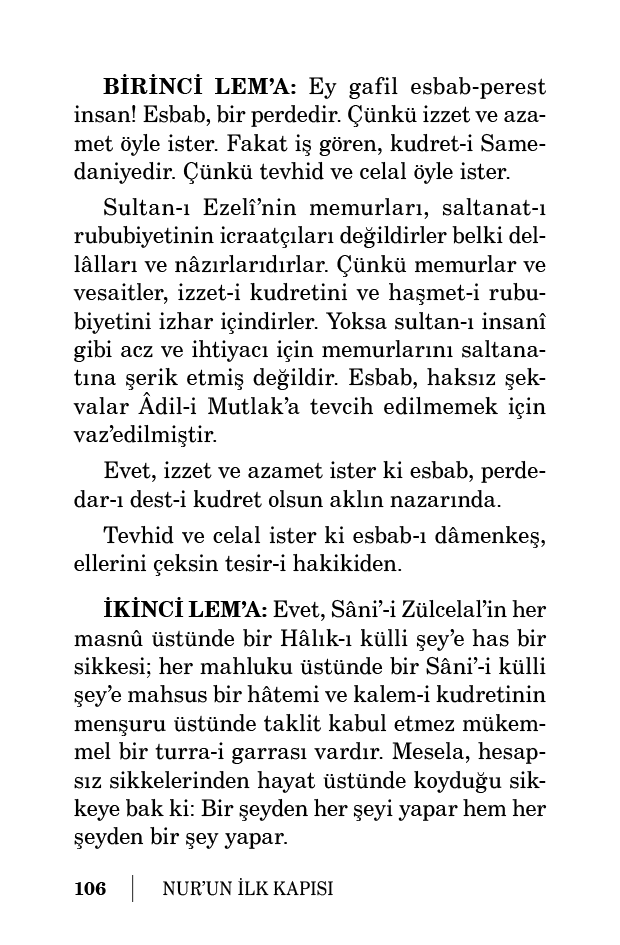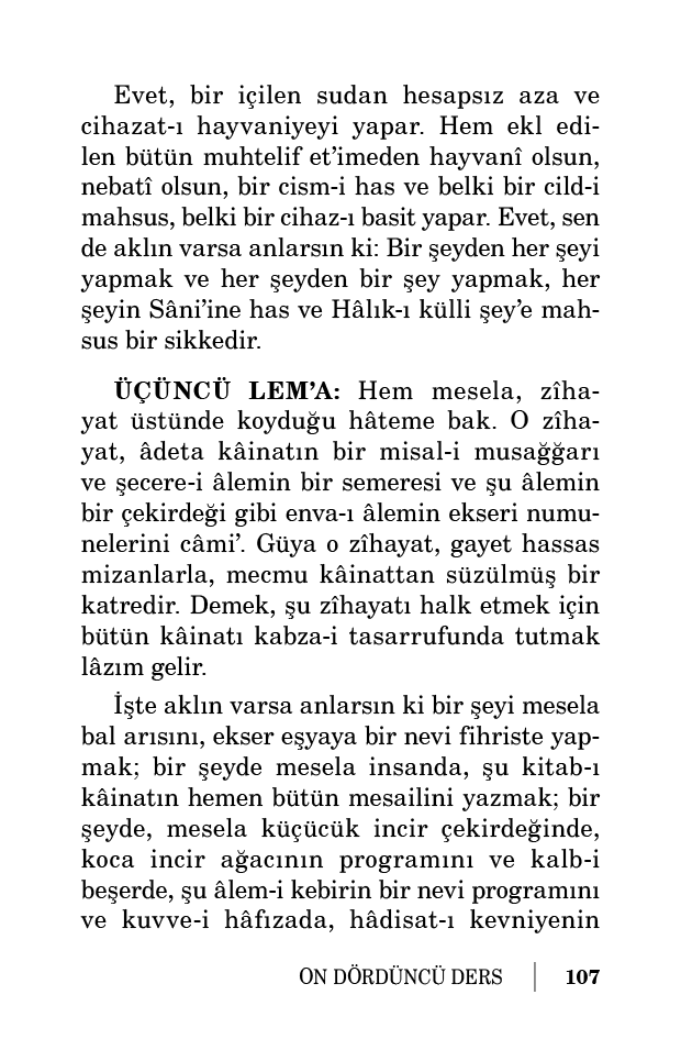 İşte aklın varsa anlarsın ki bir şeyi mesela bal arısını, ekser eşyaya bir nevi fihriste yapmak; bir şeyde mesela insanda, şu kitab-ı kâinatın hemen bütün mesailini yazmak; bir şeyde, mesela küçücük incir çekirdeğinde, koca incir ağacının programını ve kalb-i beşerde, şu âlem-i kebirin bir nevi programını ve kuvve-i hâfızada, hâdisat-ı kevniyenin