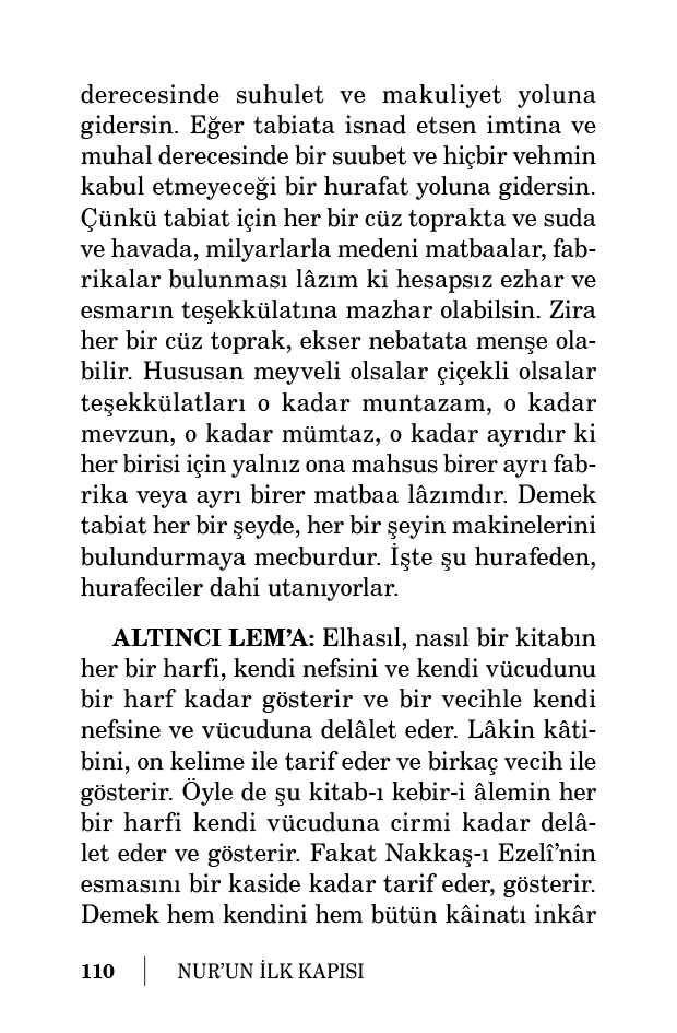 YEDİNCİ LEM’A: Nasıl ki her bir mahluk-u cüz’î üstünde ehadiyetin sikkesi olduğu gibi; her bir nevi üstünde, her bir küll üstünde tâ mecmu âlem üstünde sikke-i ehadiyet ve hâtem-i vâhidiyet ve turra-i vahdet gayet parlak bir surette vaz’edilmiştir. İşte bak, sath-ı arzın sahifesinde, bahar mevsiminde, Nakkaş-ı Ezelî en ekall üç yüz bin nebatat ve hayvanat envaını haşir ve neşreder. Nihayetsiz ihtilat ve karışıklık içinde, nihayet derecede imtiyaz ve intizam ile bunları iade edip haşrediyor. Çendan bir kısmını aynen iade etmiyor. Fakat ayniyet derecesinde bir müşabehet ve bir misliyetle iade ediyor.