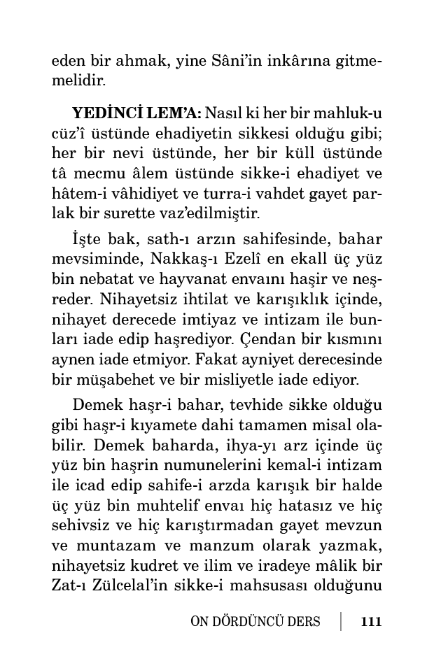 Demek haşr-i bahar, tevhide sikke olduğu gibi haşr-i kıyamete dahi tamamen misal olabilir. Demek baharda, ihya-yı arz içinde üç yüz bin haşrin numunelerini kemal-i intizam ile icad edip sahife-i arzda karışık bir halde üç yüz bin muhtelif envaı hiç hatasız ve hiç sehivsiz ve hiç karıştırmadan gayet mevzun ve muntazam ve manzum olarak yazmak, nihayetsiz kudret ve ilim ve iradeye mâlik bir Zat-ı Zülcelal’in sikke-i mahsusası olduğunu
