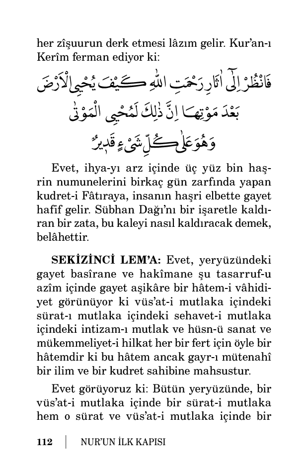 suhulet-i mutlaka hem o suhulet ve sürat ve vüs’at-i mutlaka ile beraber bir cûd ve sehavet-i mutlaka içinde, nevilerde olduğu gibi her bir fertte görülen gayet mükemmel bir intizam-ı mutlak ve gayet mümtaz bir hüsn-ü sanat ve gayet mükemmeliyet-i hilkat hem bir anda ve her yerde ve bir tarzda, her fertte müşahede edilen bir sanat-ı hârika, elbette ve elbette öyle bir zatın hâtemidir ki o Zat-ı Akdes, hiçbir yerde olmadığı halde her yerde hazırdır ve hiçbir şey ondan gizlenemediği gibi hiçbir şey ona ağır gelemez. Zerreler ve yıldızlar, onun kudretine nisbeten müsavidirler.