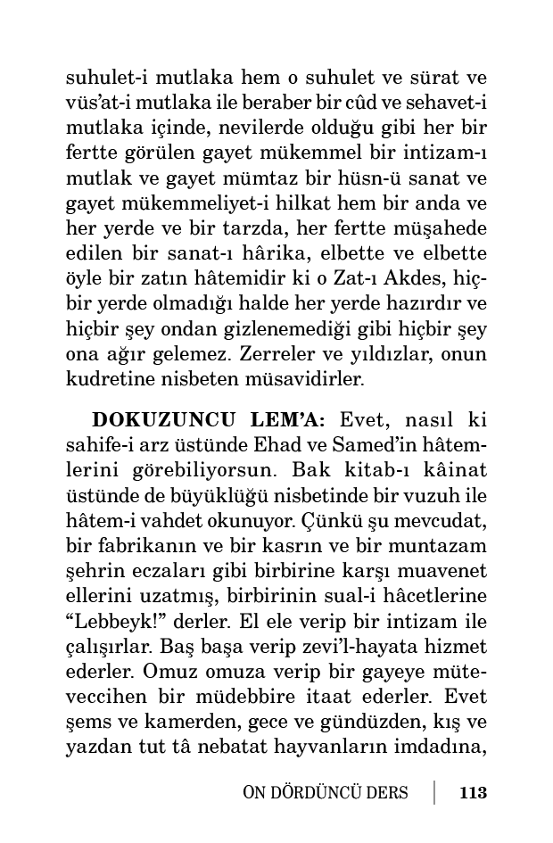 DOKUZUNCU LEM’A: Evet, nasıl ki sahife-i arz üstünde Ehad ve Samed’in hâtemlerini görebiliyorsun. Bak kitab-ı kâinat üstünde de büyüklüğü nisbetinde bir vuzuh ile hâtem-i vahdet okunuyor. Çünkü şu mevcudat, bir fabrikanın ve bir kasrın ve bir muntazam şehrin eczaları gibi birbirine karşı muavenet ellerini uzatmış, birbirinin sual-i hâcetlerine “Lebbeyk!” derler. El ele verip bir intizam ile çalışırlar. Baş başa verip zevi’l-hayata hizmet ederler. Omuz omuza verip bir gayeye müteveccihen bir müdebbire itaat ederler. Evet şems ve kamerden, gece ve gündüzden, kış ve yazdan tut tâ nebatat hayvanların imdadına,