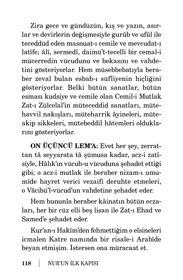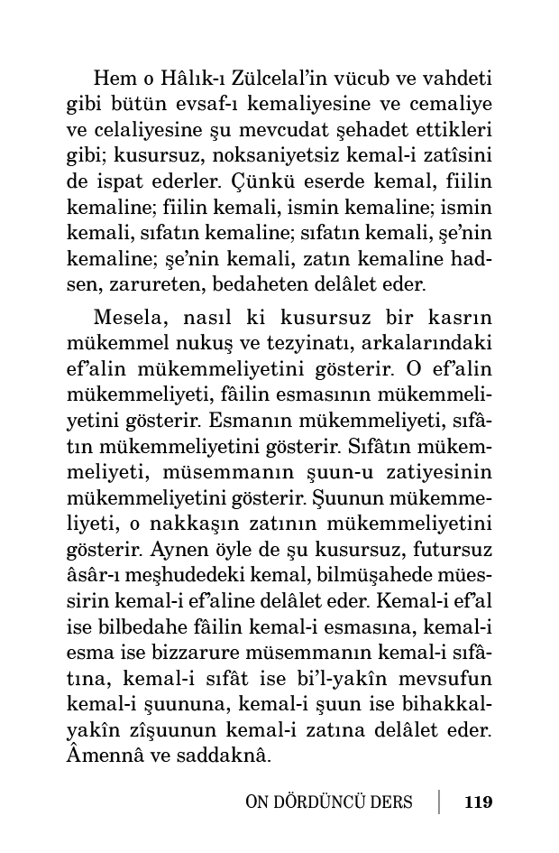 Hem o Hâlık-ı Zülcelal’in vücub ve vahdeti gibi bütün evsaf-ı kemaliyesine ve cemaliye ve celaliyesine şu mevcudat şehadet ettikleri gibi; kusursuz, noksaniyetsiz kemal-i zatîsini de ispat ederler. Çünkü eserde kemal, fiilin kemaline; fiilin kemali, ismin kemaline; ismin kemali, sıfatın kemaline; sıfatın kemali, şe’nin kemaline; şe’nin kemali, zatın kemaline hadsen, zarureten, bedaheten delâlet eder.