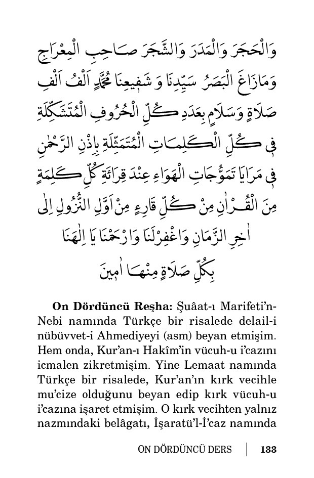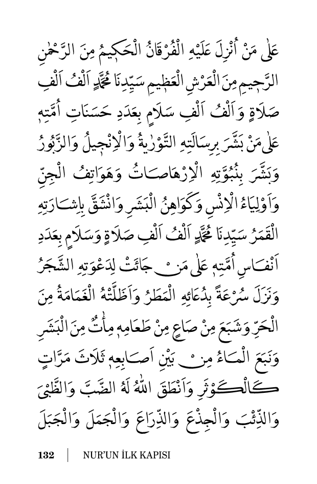 عَلٰى مَنْ اُنْزِلَ عَلَيْهِ الْفُرْقَانُ الْحَكٖيمُ مِنَ الرَّحْمٰنِ الرَّحٖيمِ مِنَ الْعَرْشِ الْعَظٖيمِ سَيِّدِنَا مُحَمَّدٍ اَلْفُ اَلْفِ صَلَاةٍ وَاَلْفُ اَلْفِ سَلَامٍ بِعَدَدِ حَسَنَاتِ اُمَّتِهٖ ٠ عَلٰى مَنْ بَشَّرَ بِرِسَالَتِهِ التَّوْرٰيةُ وَالْاِنْجٖيلُ وَالزَّبُورُ ٠ وَبَشَّرَ بِنُبُوَّتِهِ الْاِرْهَاصَاتُ وَهَوَاتِفُ الْجِنِّ وَاَوْلِيَاءُ الْاِنْسِ وَكَوَاهِنُ الْبَشَرِ ٠ وَانْشَقَّ بِاِشَارَتِهِ الْقَمَرُ ٠ سَيِّدِنَا مُحَمَّدٍ اَلْفُ اَلْفِ صَلَاةٍ وَسَلَامٍ بِعَدَدِ اَنْفَاسِ اُمَّتِهٖ ٠ عَلٰى مَنْ جَائَتْ لِدَعْوَتِهِ الشَّجَرُ وَنَزَلَ سُرْعَةً بِدُعَائِهِ الْمَطَرُ وَاَظَلَّتْهُ الْغَمَامَةُ مِنَ الْحَرِّ وَشَبَعَ مِنْ صَاعٍ مِنْ طَعَامِهٖ مِأٰتٌ مِنَ الْبَشَرِ وَنَبَعَ الْمَاءُ مِنْ بَيْنِ اَصَابِعِهٖ ثَلَاثَ مَرَّاتٍ كَالْكَوْثَرِ وَاَنْطَقَ اللّٰهُ لَهُ الضَّبَّ وَالظَّبْىَ وَالذِّئْبَ وَالْجِذْعَ وَالذِّرَاعَ وَالْجَمَلَ وَالْجَبَلَ