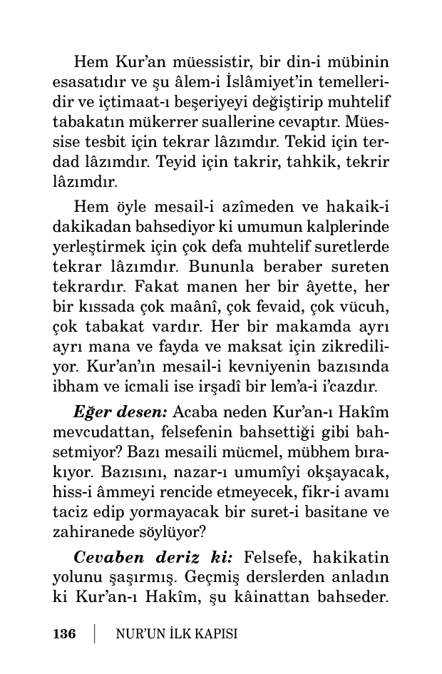 Hem Kur’an müessistir, bir din-i mübinin esasatıdır ve şu âlem-i İslâmiyet’in temelleridir ve içtimaat-ı beşeriyeyi değiştirip muhtelif tabakatın mükerrer suallerine cevaptır. Müessise tesbit için tekrar lâzımdır. Tekid için terdad lâzımdır. Teyid için takrir, tahkik, tekrir lâzımdır.