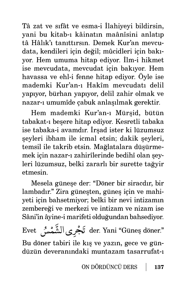 Eğer desen: Acaba neden Kur’an-ı Hakîm mevcudattan, felsefenin bahsettiği gibi bahsetmiyor? Bazı mesaili mücmel, mübhem bırakıyor. Bazısını, nazar-ı umumîyi okşayacak, hiss-i âmmeyi rencide etmeyecek, fikr-i avamı taciz edip yormayacak bir suret-i basitane ve zahiranede söylüyor?