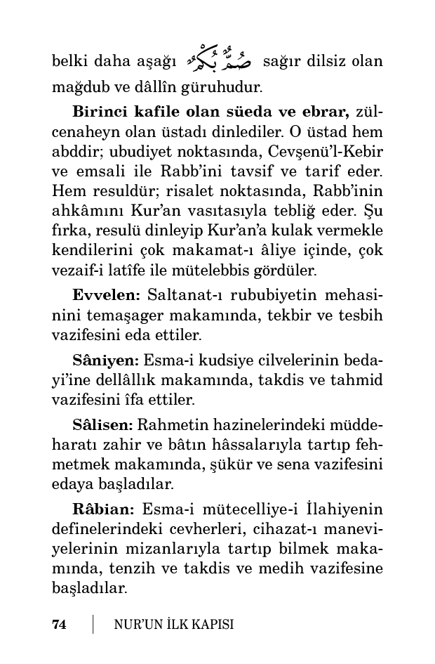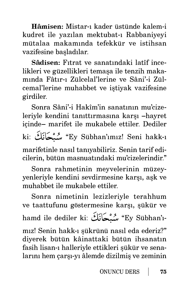 Sâdisen: Fıtrat ve sanatındaki latîf incelikleri ve güzellikleri temaşa ile tenzih makamında Fâtır-ı Zülcelal’lerine ve Sâni’-i Zülcemal’lerine muhabbet ve iştiyak vazifesine girdiler.
