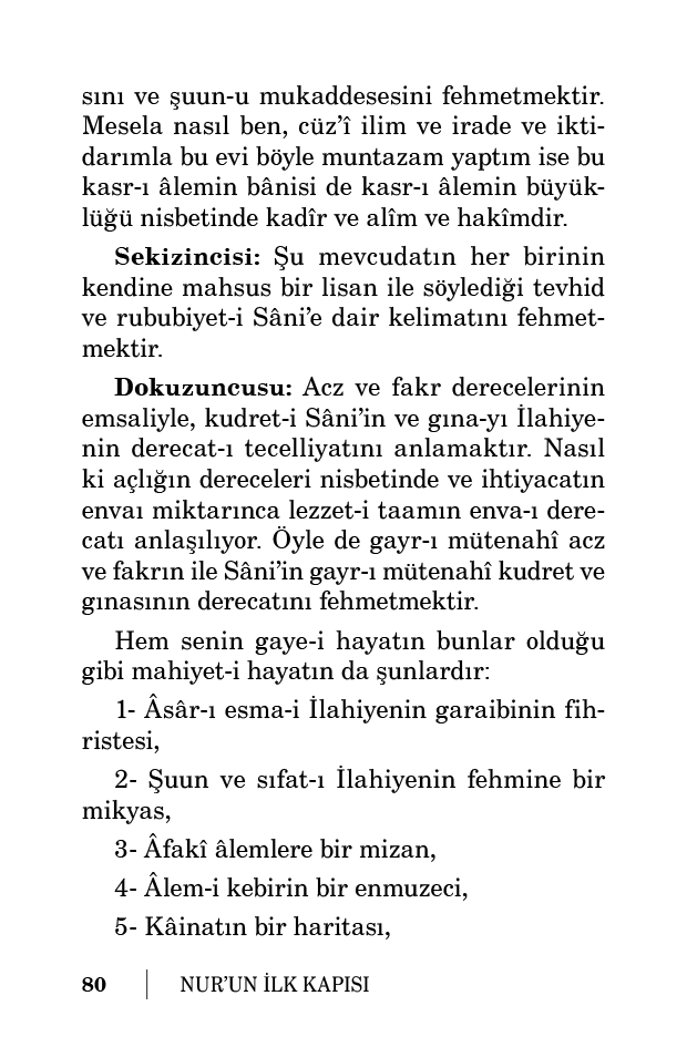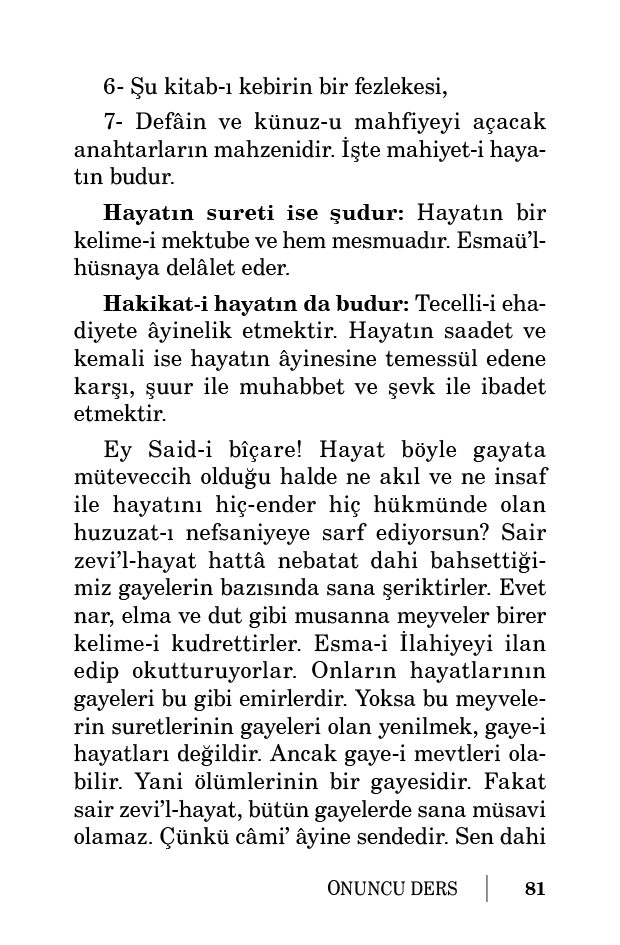 Ey Said-i bîçare! Hayat böyle gayata müteveccih olduğu halde ne akıl ve ne insaf ile hayatını hiç-ender hiç hükmünde olan huzuzat-ı nefsaniyeye sarf ediyorsun? Sair zevi’l-hayat hattâ nebatat dahi bahsettiğimiz gayelerin bazısında sana şeriktirler. Evet nar, elma ve dut gibi musanna meyveler birer kelime-i kudrettirler. Esma-i İlahiyeyi ilan edip okutturuyorlar. Onların hayatlarının gayeleri bu gibi emirlerdir. Yoksa bu meyvelerin suretlerinin gayeleri olan yenilmek, gaye-i hayatları değildir. Ancak gaye-i mevtleri olabilir. Yani ölümlerinin bir gayesidir. Fakat sair zevi’l-hayat, bütün gayelerde sana müsavi olamaz. Çünkü câmi’ âyine sendedir. Sen dahi senden çok