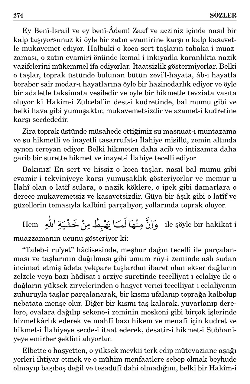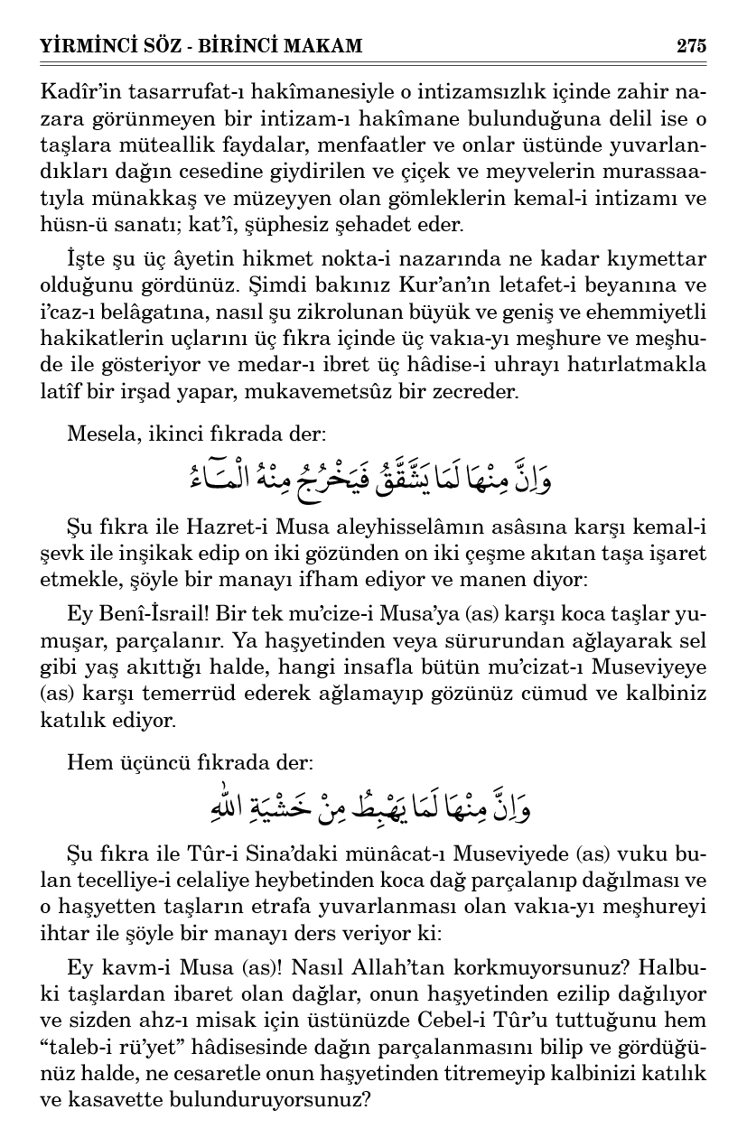 Kadîr’in tasarrufat-ı hakîmanesiyle o intizamsızlık içinde zahir nazara görünmeyen bir intizam-ı hakîmane bulunduğuna delil ise o taşlara müteallik faydalar, menfaatler ve onlar üstünde yuvarlandıkları dağın cesedine giydirilen ve çiçek ve meyvelerin murassaatıyla münakkaş ve müzeyyen olan gömleklerin kemal-i intizamı ve hüsn-ü sanatı; kat’î, şüphesiz şehadet eder.
