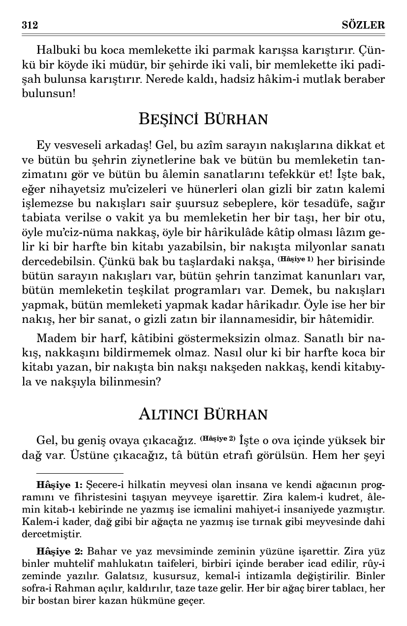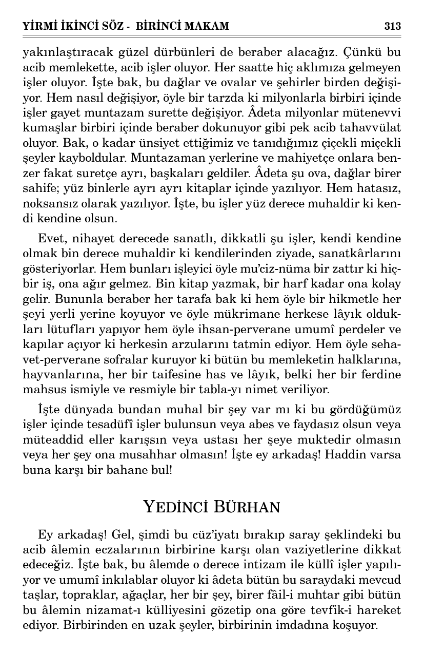 Evet, nihayet derecede sanatlı, dikkatli şu işler, kendi kendine olmak bin derece muhaldir ki kendilerinden ziyade, sanatkârlarını gösteriyorlar. Hem bunları işleyici öyle mu’ciz-nüma bir zattır ki hiçbir iş, ona ağır gelmez. Bin kitap yazmak, bir harf kadar ona kolay gelir. Bununla beraber her tarafa bak ki hem öyle bir hikmetle her şeyi yerli yerine koyuyor ve öyle mükrimane herkese lâyık oldukları lütufları yapıyor hem öyle ihsan-perverane umumî perdeler ve kapılar açıyor ki herkesin arzularını tatmin ediyor. Hem öyle sehavet-perverane sofralar kuruyor ki bütün bu memleketin halklarına, hayvanlarına, her bir taifesine has ve lâyık, belki her bir ferdine mahsus ismiyle ve resmiyle bir tabla-yı nimet veriliyor.