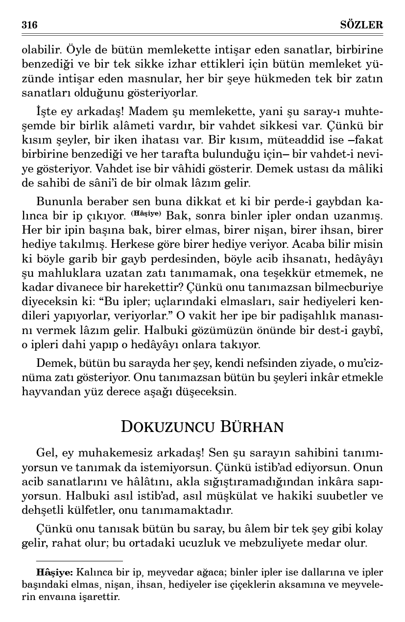 Gel, ey bir parça insafa gelmiş arkadaş! On beş gündür (Hâşiye 2) biz buradayız. Eğer şu âlemin nizamlarını bilmezsek, padişahını tanımazsak cezaya müstahak oluruz. Özrümüz kalmadı. Zira on beş gün güya bize mühlet verilmiş gibi bize ilişmiyorlar. Elbette biz başıboş değiliz. Bu derece nazik sanatlı, mizanlı, letafetli, ibretli masnular içinde hayvan gibi gezip bozamayız, bize bozdurmazlar. Şu memleketin haşmetli mâlikinin elbette cezası da dehşetlidir.