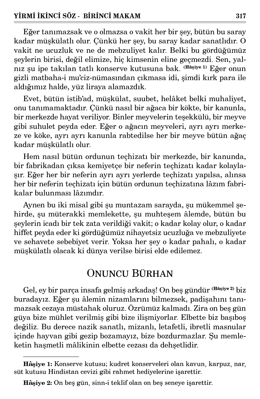 Eğer tanımazsak ve o olmazsa o vakit her bir şey, bütün bu saray kadar müşkülatlı olur. Çünkü her şey, bu saray kadar sanatlıdır. O vakit ne ucuzluk ve ne de mebzuliyet kalır. Belki bu gördüğümüz şeylerin birisi, değil elimize, hiç kimsenin eline geçmezdi. Sen, yalnız şu ipe takılan tatlı konserve kutusuna bak (Hâşiye 1). Eğer onun gizli matbaha-i mu’ciz-nümasından çıkmasa idi, şimdi kırk para ile aldığımız halde, yüz liraya alamazdık.