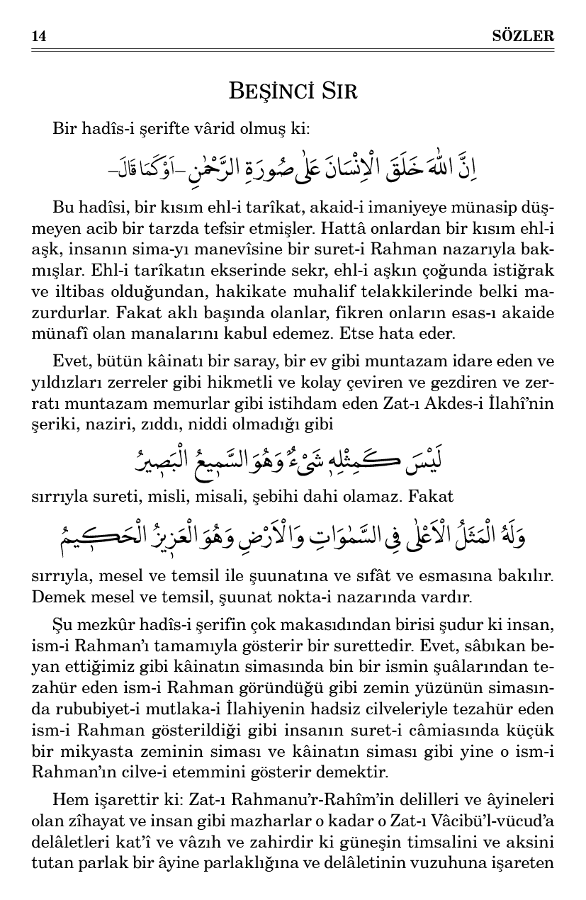 Şu mezkûr hadîs-i şerifin çok makasıdından birisi şudur ki insan, ism-i Rahman’ı tamamıyla gösterir bir surettedir. Evet, sâbıkan beyan ettiğimiz gibi kâinatın simasında bin bir ismin şuâlarından tezahür eden ism-i Rahman göründüğü gibi zemin yüzünün simasında rububiyet-i mutlaka-i İlahiyenin hadsiz cilveleriyle tezahür eden ism-i Rahman gösterildiği gibi insanın suret-i câmiasında küçük bir mikyasta zeminin siması ve kâinatın siması gibi yine o ism-i Rahman’ın cilve-i etemmini gösterir demektir.