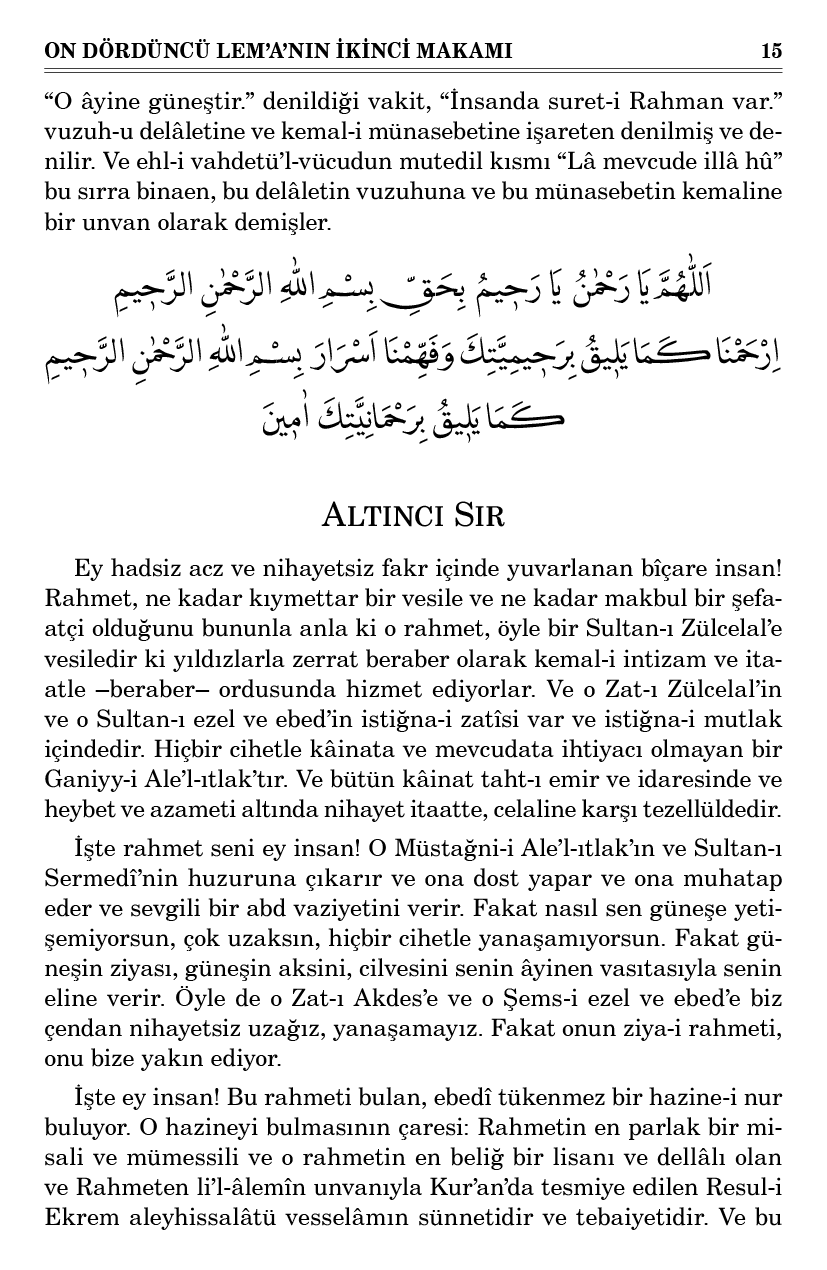 Hem işarettir ki: Zat-ı Rahmanu’r-Rahîm’in delilleri ve âyineleri olan zîhayat ve insan gibi mazharlar o kadar o Zat-ı Vâcibü’l-vücud’a delâletleri kat’î ve vâzıh ve zahirdir ki güneşin timsalini ve aksini tutan parlak bir âyine parlaklığına ve delâletinin vuzuhuna işareten