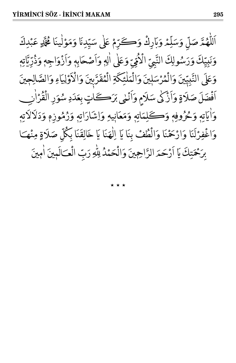 اَللّٰهُمَّ صَلِّ وَسَلِّمْ وَبَارِكْ وَكَرِّمْ عَلٰى سَيِّدِنَا وَمَوْلٰينَا مُحَمَّدٍ عَبْدِكَ وَنَبِيِّكَ وَرَسُولِكَ النَّبِىِّ الْاُمِّىِّ وَعَلٰى اٰلِهٖ وَاَصْحَابِهٖ وَاَزْوَاجِهٖ وَذُرِّيَّاتِهٖ وَعَلَى النَّبِيّٖينَ وَالْمُرْسَلٖينَ وَالْمَلٰئِكَةِ الْمُقَرَّبٖينَ وَالْاَوْلِيَاءِ وَالصَّالِحٖينَ اَفْضَلَ صَلَاةٍ وَاَزْكٰى سَلَامٍ وَاَنْمٰى بَرَكَاتٍ بِعَدَدِ سُوَرِ الْقُرْاٰنِ وَاٰيَاتِهٖ وَحُرُوفِهٖ وَكَلِمَاتِهٖ وَمَعَانٖيهِ وَاِشَارَاتِهٖ وَرُمُوزِهٖ وَدَلَالَاتِهٖ وَاغْفِرْلَنَا وَارْحَمْنَا وَالْطُفْ بِنَا يَا اِلٰهَنَا يَا خَالِقَنَا بِكُلِّ صَلَاةٍ مِنْهَا بِرَحْمَتِكَ يَا اَرْحَمَ الرَّاحِمٖينَ وَالْحَمْدُ لِلّٰهِ رَبِّ الْعَالَمٖينَ اٰمٖينَ