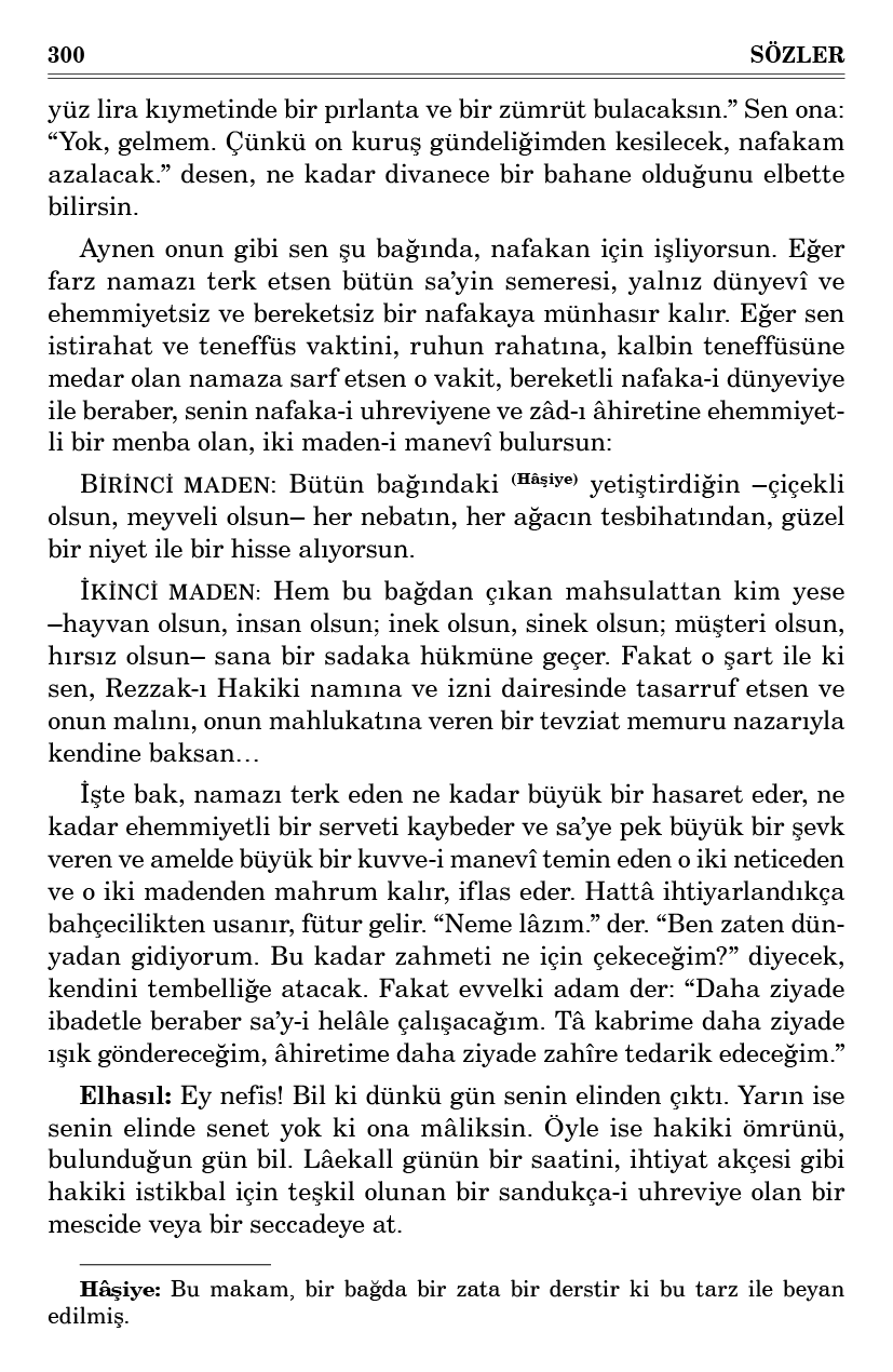 Sakın deme: “Benim namazım nerede, şu hakikat-i namaz nerede?” Zira bir hurma çekirdeği, bir hurma ağacı gibi kendi ağacını tavsif eder. Fark yalnız icmal ve tafsil ile olduğu gibi; senin ve benim gibi bir âmînin –velev hissetmezse– namazı, büyük bir velinin namazı gibi şu nurdan bir hissesi var, şu hakikatten bir sırrı vardır, velev şuurun taalluk etmezse. Fakat derecata göre inkişaf ve tenevvürü ayrı ayrıdır. Nasıl bir hurma çekirdeğinden, tâ mükemmel bir hurma ağacına kadar ne kadar meratib bulunur. Öyle de namazın derecatında da daha fazla meratib bulunabilir. Fakat bütün o meratibde, o hakikat-i nuraniyenin esası bulunur.