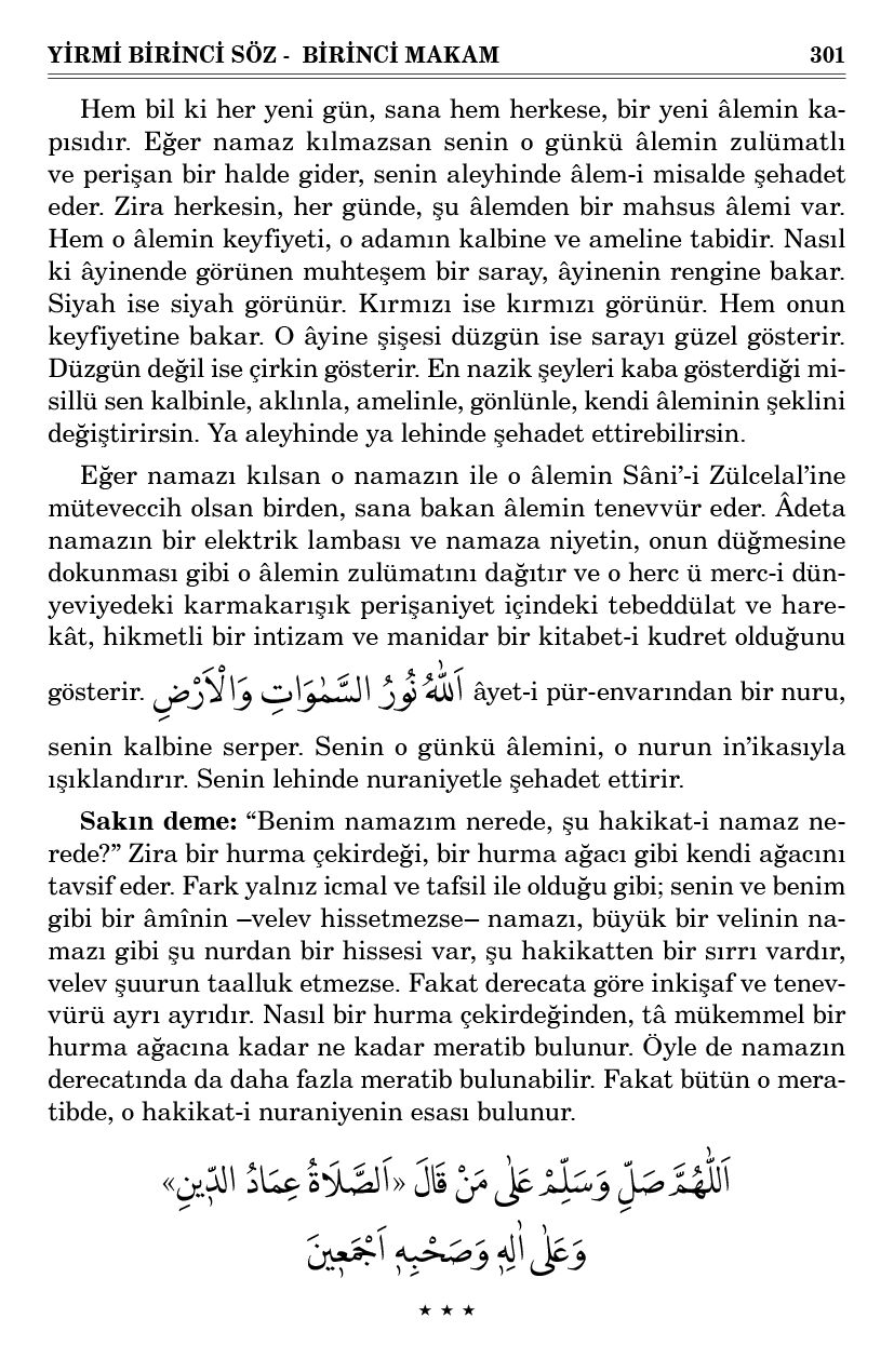 Eğer namazı kılsan o namazın ile o âlemin Sâni’-i Zülcelal’ine müteveccih olsan birden, sana bakan âlemin tenevvür eder. Âdeta namazın bir elektrik lambası ve namaza niyetin, onun düğmesine dokunması gibi o âlemin zulümatını dağıtır ve o herc ü merc-i dünyeviyedeki karmakarışık perişaniyet içindeki tebeddülat ve harekât, hikmetli bir intizam ve manidar bir kitabet-i kudret olduğunu gösterir. اَللّٰهُ نُورُ السَّمٰوَاتِ وَالْاَرْضِ âyet-i pür-envarından bir nuru, senin kalbine serper. Senin o günkü âlemini, o nurun in’ikasıyla ışıklandırır. Senin lehinde nuraniyetle şehadet ettirir.