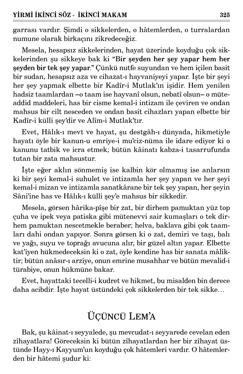 Mesela, hesapsız sikkelerinden, hayat üzerinde koyduğu çok sikkelerinden şu sikkeye bak ki “Bir şeyden her şey yapar hem her şeyden bir tek şey yapar.” Çünkü nutfe suyundan ve hem içilen basit bir sudan, hesapsız aza ve cihazat-ı hayvaniyeyi yapar. İşte bir şeyi her şey yapmak elbette bir Kadîr-i Mutlak’ın işidir. Hem yenilen hadsiz taamlardan –o taam ise hayvanî olsun, nebatî olsun– o müteaddid maddeleri, has bir cisme kemal-i intizam ile çeviren ve ondan mahsus bir cilt nesceden ve ondan basit cihazları yapan elbette bir Kadîr-i külli şey’dir ve Alîm-i Mutlak’tır.