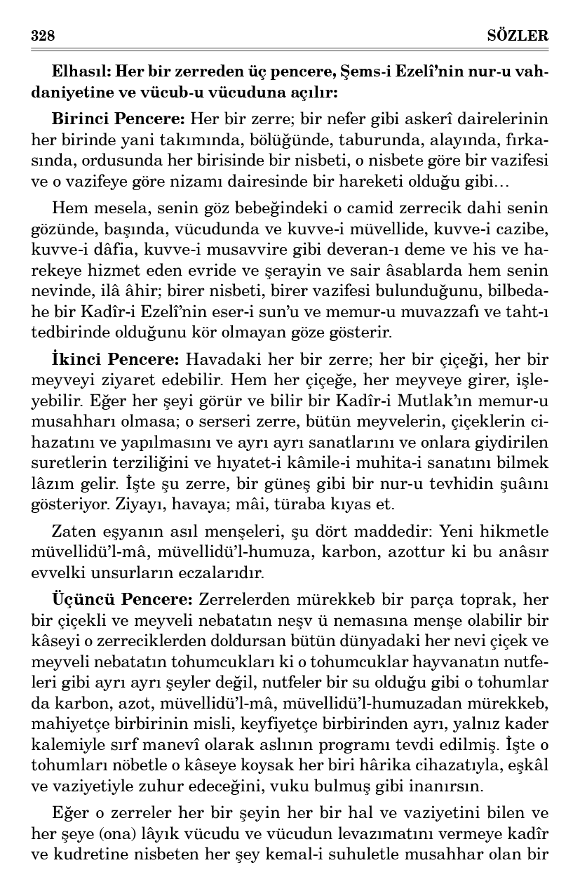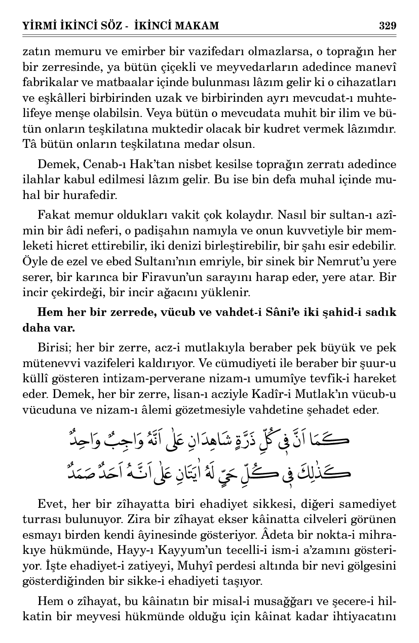 Birisi; her bir zerre, acz-i mutlakıyla beraber pek büyük ve pek mütenevvi vazifeleri kaldırıyor. Ve cümudiyeti ile beraber bir şuur-u küllî gösteren intizam-perverane nizam-ı umumîye tevfik-i hareket eder. Demek, her bir zerre, lisan-ı acziyle Kadîr-i Mutlak’ın vücub-u vücuduna ve nizam-ı âlemi gözetmesiyle vahdetine şehadet eder.