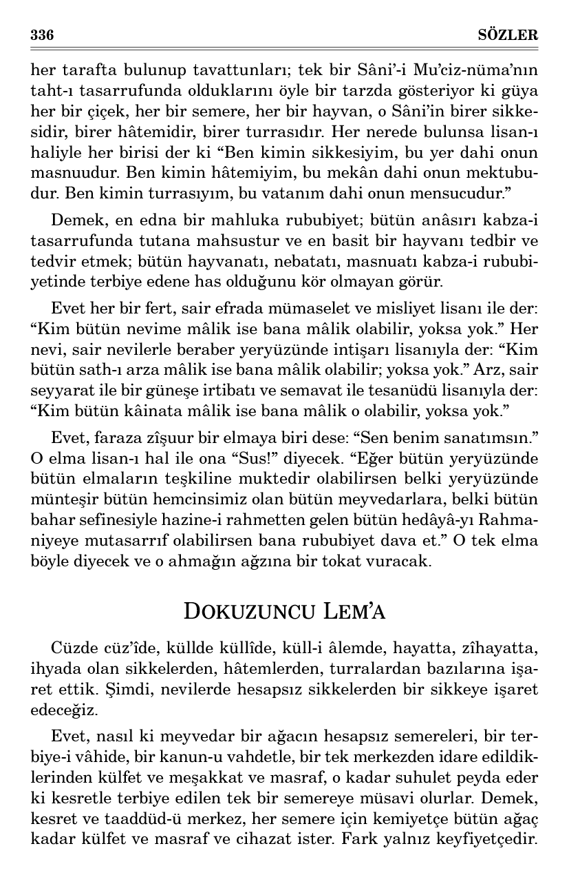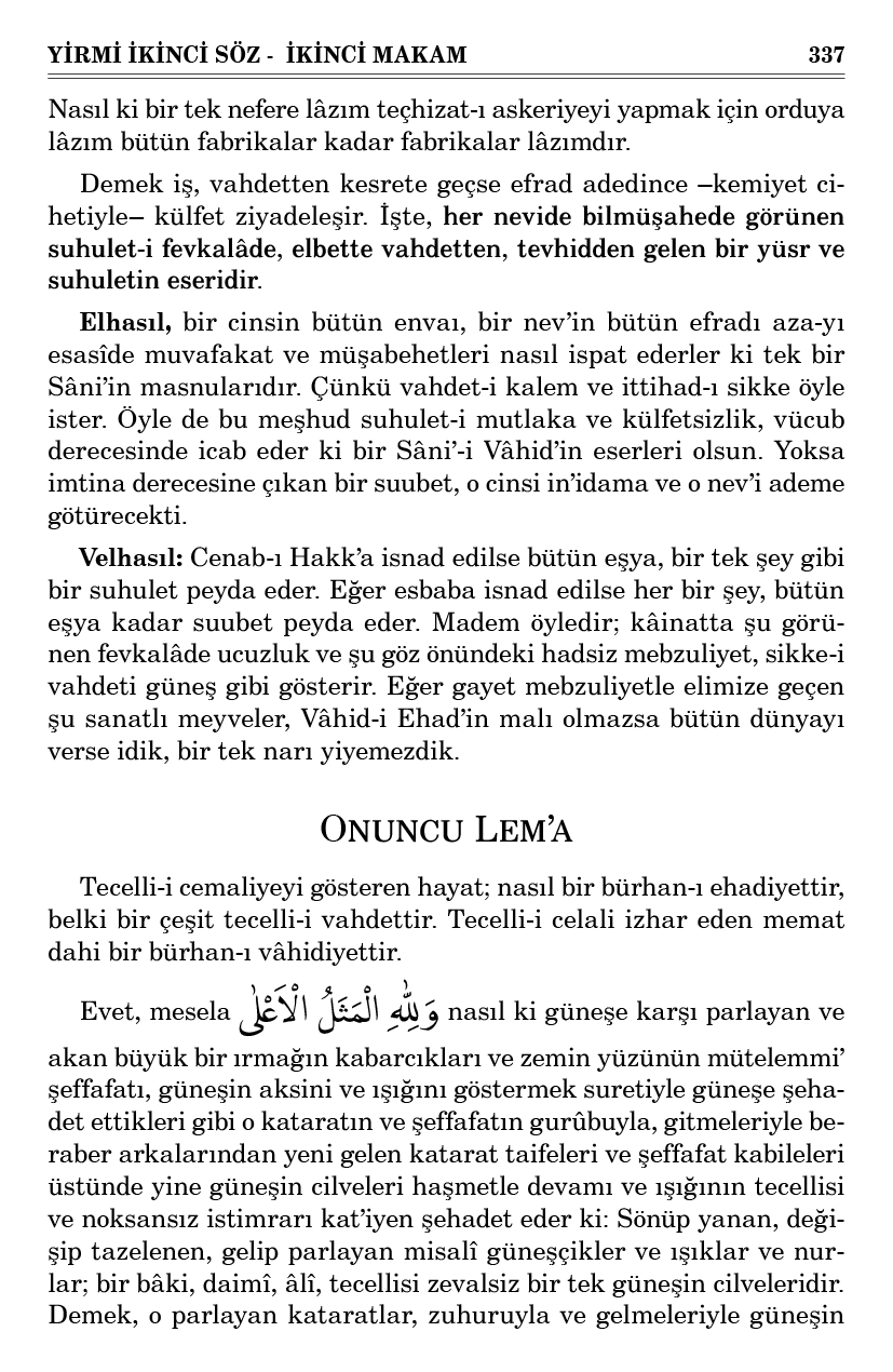 Tecelli-i cemaliyeyi gösteren hayat; nasıl bir bürhan-ı ehadiyettir, belki bir çeşit tecelli-i vahdettir. Tecelli-i celali izhar eden memat dahi bir bürhan-ı vâhidiyettir.