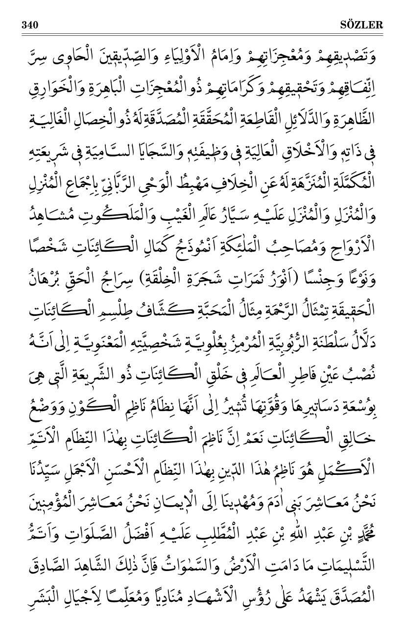 Evet, o Kur’an’a selim bir kalp gözüyle baksan göreceksin ki cihat-ı sittesi öyle parlıyor, öyle şeffaftır ki hiçbir zulmet, hiçbir dalalet, hiçbir şüphe ve rayb, hiçbir hile içine girmeye ve daire-i ismetine duhûle fürce bulamaz. Çünkü üstünde sikke-i i’caz, altında bürhan ve delil, arkasında nokta-i istinadı mahz-ı vahy-i Rabbanî, önünde saadet-i dâreyn, sağında aklı istintak edip tasdikini temin, solunda vicdanı istişhad ederek teslimini tesbit, içi bilbedahe safi hidayet-i Rahmaniye, üstü bilmüşahede hâlis envar-ı imaniye, meyveleri biaynelyakîn kemalât-ı insaniye ile müzeyyen asfiya ve muhakkikîn, evliya ve sıddıkîn olan o lisan-ı gaybın sinesine kulağını yapıştırıp dinlesen; derinden derine, gayet munis ve mukni, nihayet ciddi ve ulvi ve bürhan ile mücehhez bir sadâ-yı semavî işiteceksin ki öyle bir