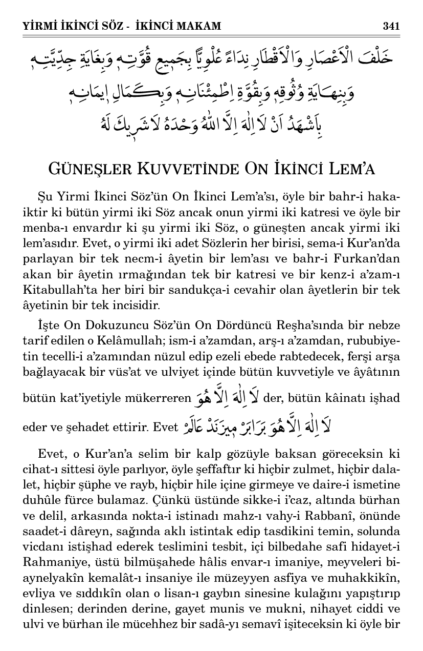 Şu Yirmi İkinci Söz’ün On İkinci Lem’a’sı, öyle bir bahr-i hakaiktir ki bütün yirmi iki Söz ancak onun yirmi iki katresi ve öyle bir menba-ı envardır ki şu yirmi iki Söz, o güneşten ancak yirmi iki lem’asıdır. Evet, o yirmi iki adet Sözlerin her birisi, sema-i Kur’an’da parlayan bir tek necm-i âyetin bir lem’ası ve bahr-i Furkan’dan akan bir âyetin ırmağından tek bir katresi ve bir kenz-i a’zam-ı Kitabullah’ta her biri bir sandukça-i cevahir olan âyetlerin bir tek âyetinin bir tek incisidir.