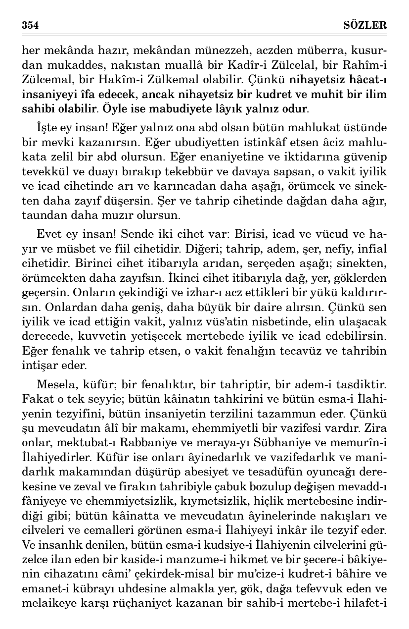İşte ey insan! Eğer yalnız ona abd olsan bütün mahlukat üstünde bir mevki kazanırsın. Eğer ubudiyetten istinkâf etsen âciz mahlukata zelil bir abd olursun. Eğer enaniyetine ve iktidarına güvenip tevekkül ve duayı bırakıp tekebbür ve davaya sapsan, o vakit iyilik ve icad cihetinde arı ve karıncadan daha aşağı, örümcek ve sinekten daha zayıf düşersin. Şer ve tahrip cihetinde dağdan daha ağır, taundan daha muzır olursun.