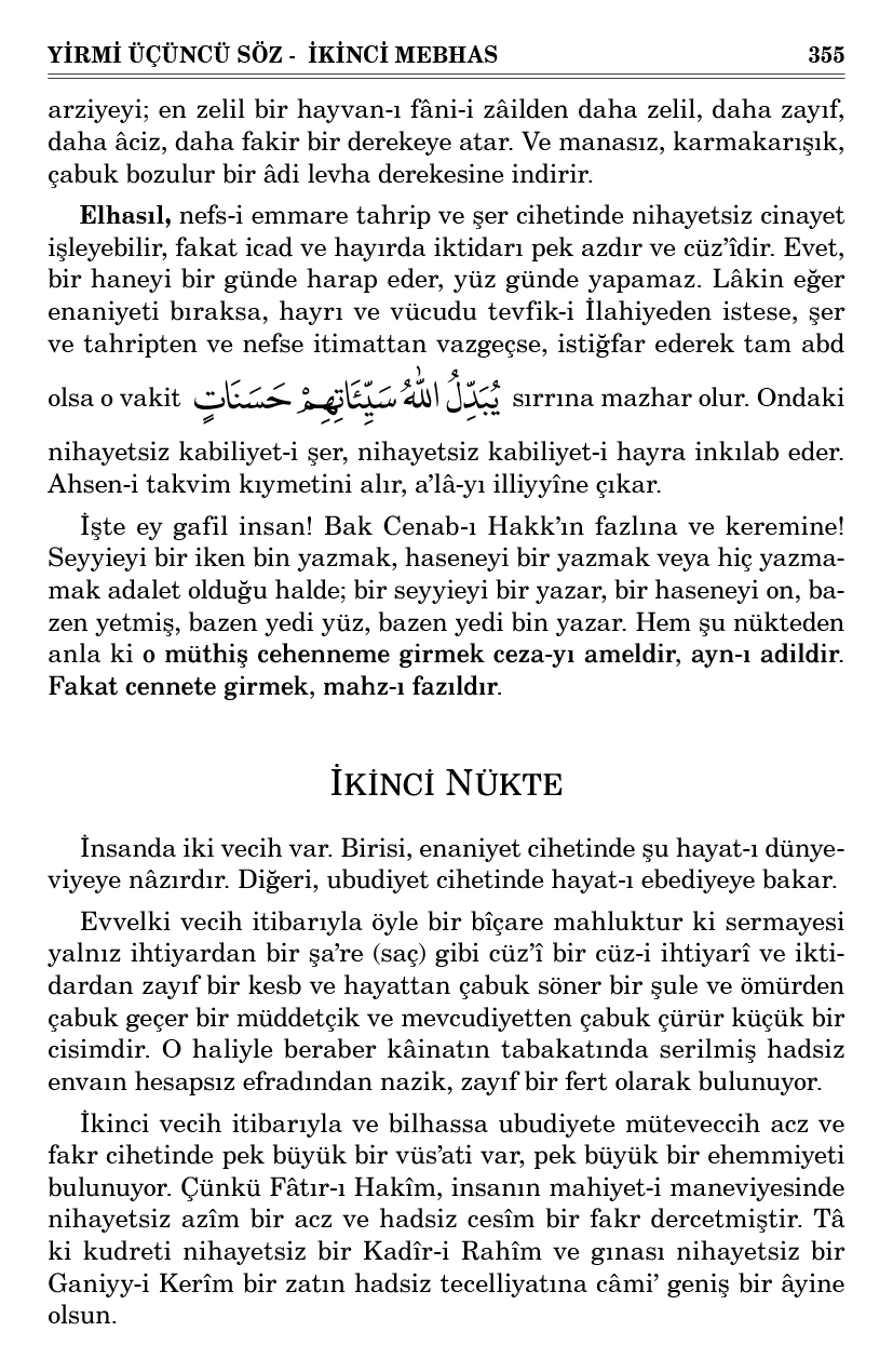 Evet ey insan! Sende iki cihet var: Birisi, icad ve vücud ve hayır ve müsbet ve fiil cihetidir. Diğeri; tahrip, adem, şer, nefiy, infial cihetidir. Birinci cihet itibarıyla arıdan, serçeden aşağı; sinekten, örümcekten daha zayıfsın. İkinci cihet itibarıyla dağ, yer, göklerden geçersin. Onların çekindiği ve izhar-ı acz ettikleri bir yükü kaldırırsın. Onlardan daha geniş, daha büyük bir daire alırsın. Çünkü sen iyilik ve icad ettiğin vakit, yalnız vüs’atin nisbetinde, elin ulaşacak derecede, kuvvetin yetişecek mertebede iyilik ve icad edebilirsin. Eğer fenalık ve tahrip etsen, o vakit fenalığın tecavüz ve tahribin intişar eder.
