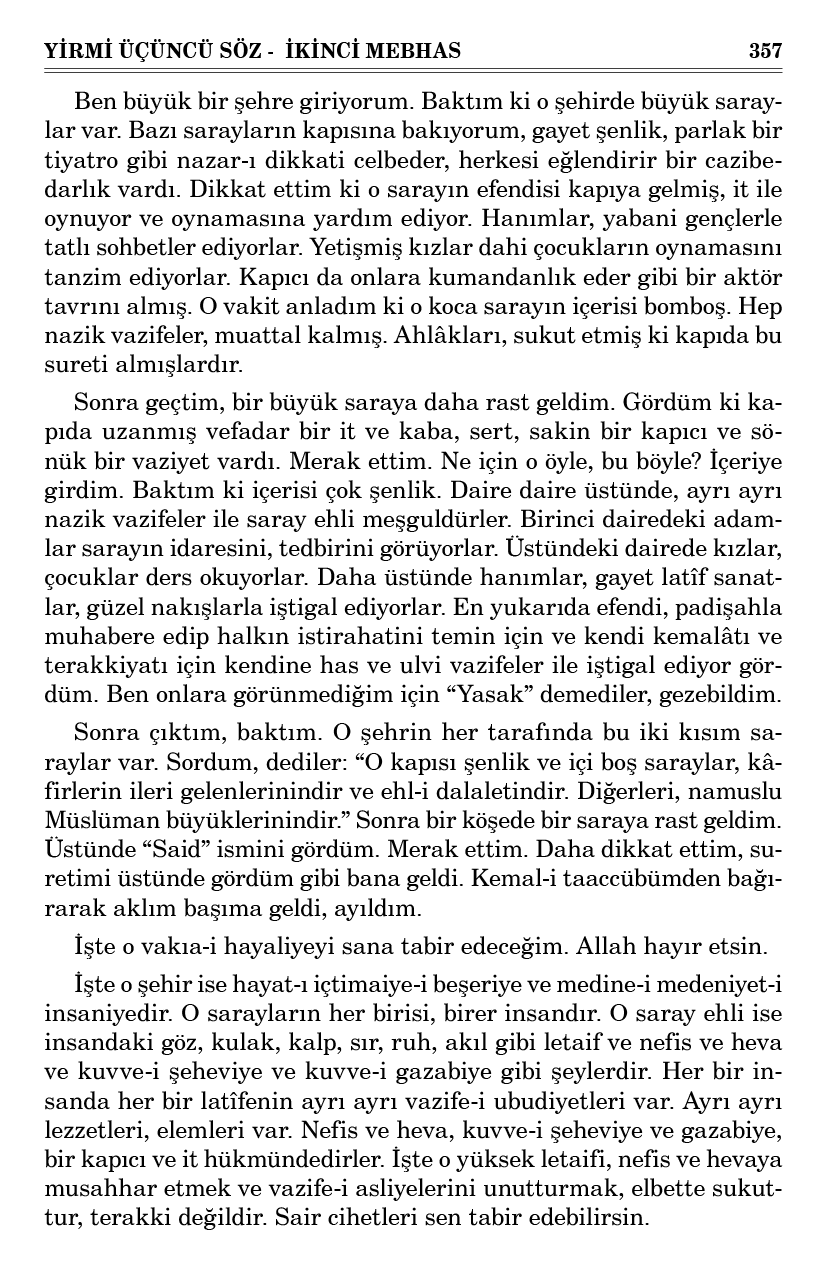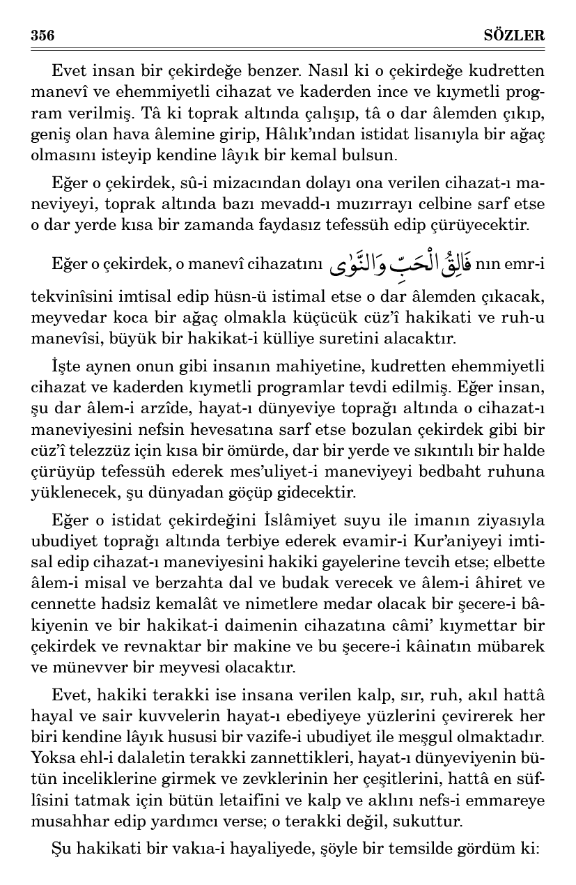 Eğer o istidat çekirdeğini İslâmiyet suyu ile imanın ziyasıyla ubudiyet toprağı altında terbiye ederek evamir-i Kur’aniyeyi imtisal edip cihazat-ı maneviyesini hakiki gayelerine tevcih etse; elbette âlem-i misal ve berzahta dal ve budak verecek ve âlem-i âhiret ve cennette hadsiz kemalât ve nimetlere medar olacak bir şecere-i bâkiyenin ve bir hakikat-i daimenin cihazatına câmi’ kıymettar bir çekirdek ve revnaktar bir makine ve bu şecere-i kâinatın mübarek ve münevver bir meyvesi olacaktır.