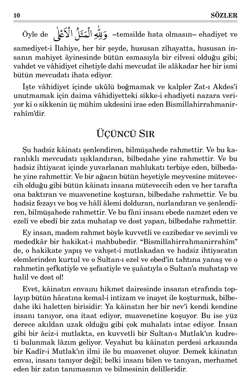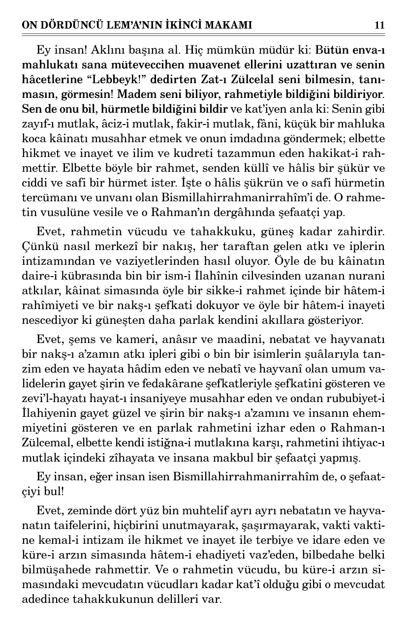 Şu hadsiz kâinatı şenlendiren, bilmüşahede rahmettir. Ve bu karanlıklı mevcudatı ışıklandıran, bilbedahe yine rahmettir. Ve bu hadsiz ihtiyacat içinde yuvarlanan mahlukatı terbiye eden, bilbedahe yine rahmettir. Ve bir ağacın bütün heyetiyle meyvesine müteveccih olduğu gibi bütün kâinatı insana müteveccih eden ve her tarafta ona baktıran ve muavenetine koşturan, bilbedahe rahmettir. Ve bu hadsiz fezayı ve boş ve hâlî âlemi dolduran, nurlandıran ve şenlendiren, bilmüşahede rahmettir. Ve bu fâni insanı ebede namzet eden ve ezelî ve ebedî bir zata muhatap ve dost yapan, bilbedahe rahmettir.