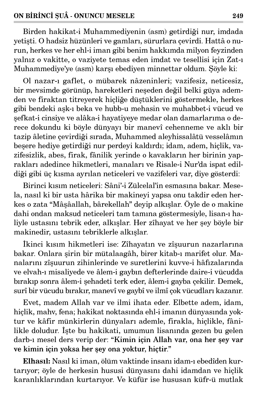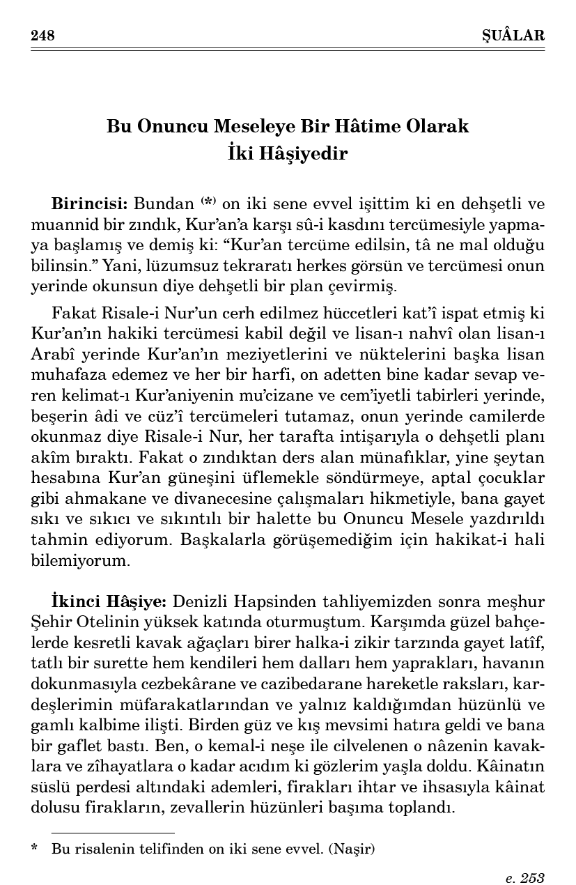 Fakat Risale-i Nur’un cerh edilmez hüccetleri kat’î ispat etmiş ki Kur’an’ın hakiki tercümesi kabil değil ve lisan-ı nahvî olan lisan-ı Arabî yerinde Kur’an’ın meziyetlerini ve nüktelerini başka lisan muhafaza edemez ve her bir harfi, on adetten bine kadar sevap veren kelimat-ı Kur’aniyenin mu’cizane ve cem’iyetli tabirleri yerinde, beşerin âdi ve cüz’î tercümeleri tutamaz, onun yerinde camilerde okunmaz diye Risale-i Nur, her tarafta intişarıyla o dehşetli planı akîm bıraktı. Fakat o zındıktan ders alan münafıklar, yine şeytan hesabına Kur’an güneşini üflemekle söndürmeye, aptal çocuklar gibi ahmakane ve divanecesine çalışmaları hikmetiyle, bana gayet sıkı ve sıkıcı ve sıkıntılı bir halette bu Onuncu Mesele yazdırıldı tahmin ediyorum. Başkalarla görüşemediğim için hakikat-i hali bilemiyorum.