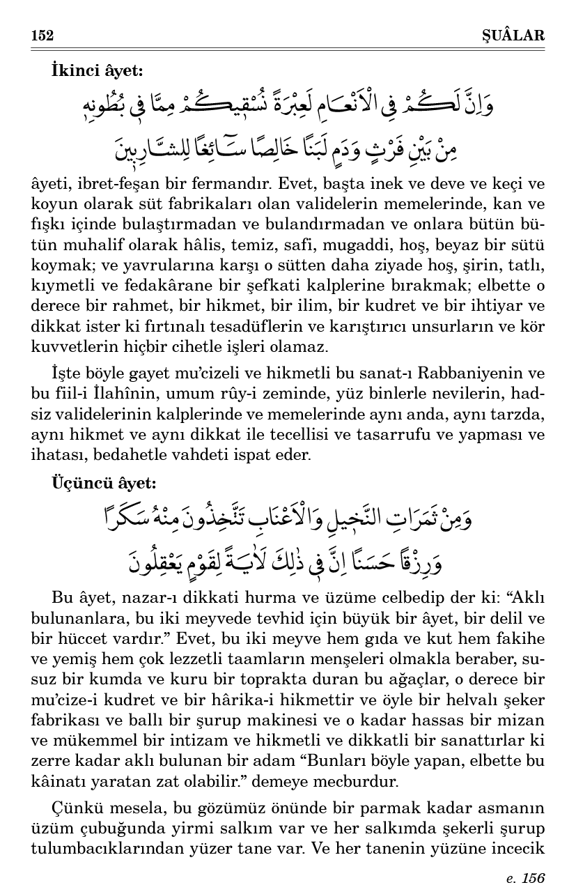 ve güzel ve latîf ve renkli bir mahfazayı giydirmek ve nazik ve yumuşak kalbinde, kuvve-i hâfızası ve programı ve tarihçe-i hayatı hükmünde olan sert kabuklu, ceviz içli çekirdekleri koymak ve karnında cennet helvası gibi bir tatlıyı ve âb-ı kevser gibi bir balı yapmak ve bütün zemin yüzünde, hadsiz emsalinde aynı dikkat, aynı hikmet, aynı hârika-i sanatı, aynı zamanda, aynı tarzda yaratmak, elbette bedahetle gösterir ki bu işi yapan; bütün kâinatın Hâlık’ıdır ve nihayetsiz bir kudreti ve hadsiz bir hikmeti iktiza eden şu fiil ancak onun fiilidir.