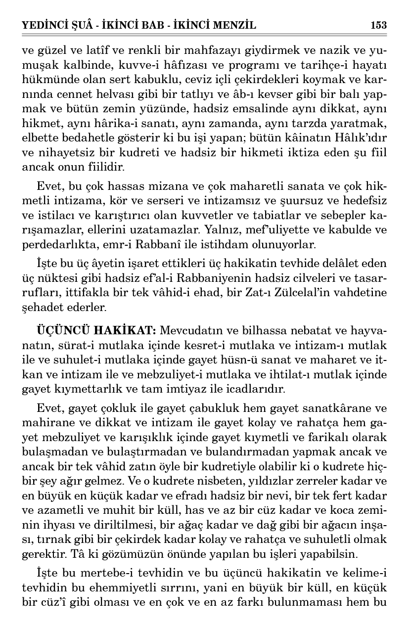 ÜÇÜNCÜ HAKİKAT: Mevcudatın ve bilhassa nebatat ve hayvanatın, sürat-i mutlaka içinde kesret-i mutlaka ve intizam-ı mutlak ile ve suhulet-i mutlaka içinde gayet hüsn-ü sanat ve maharet ve itkan ve intizam ile ve mebzuliyet-i mutlaka ve ihtilat-ı mutlak içinde gayet kıymettarlık ve tam imtiyaz ile icadlarıdır.
