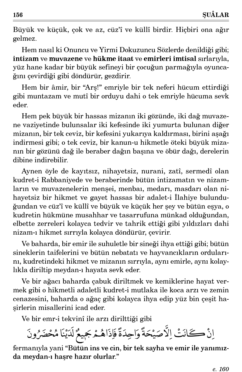 Hem مَا خَلْقُكُمْ وَلَا بَعْثُكُمْ اِلَّا كَنَفْسٍ وَاحِدَةٍ âyetiyle yani “Ey insanlar! Sizin icad ve ihyanız ve haşir ve neşriniz, bir tek nefsin ihyası gibi kolaydır. Kudretime ağır gelmez.” mealinde bulunan şu üç âyetin sırrıyla, aynı emir ile aynı kolaylıkla bütün ins ve cinleri ve hayvanı ve ruhanî ve melekleri haşr-i ekberin meydanına ve mizan-ı a’zamın önüne getirir. Bir iş bir işe mani olmaz.