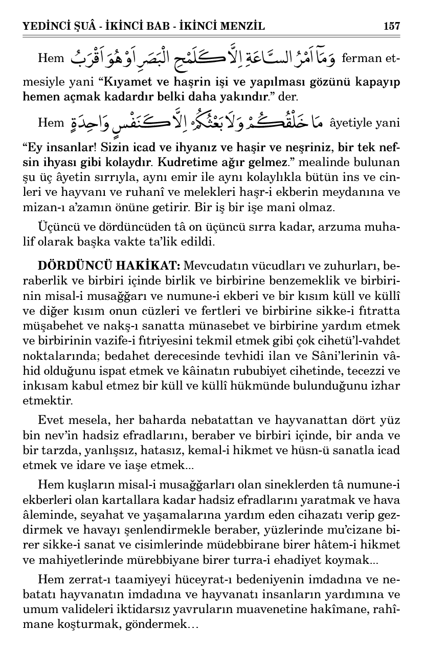 DÖRDÜNCÜ HAKİKAT: Mevcudatın vücudları ve zuhurları, beraberlik ve birbiri içinde birlik ve birbirine benzemeklik ve birbirinin misal-i musağğarı ve numune-i ekberi ve bir kısım küll ve küllî ve diğer kısım onun cüzleri ve fertleri ve birbirine sikke-i fıtratta müşabehet ve nakş-ı sanatta münasebet ve birbirine yardım etmek ve birbirinin vazife-i fıtriyesini tekmil etmek gibi çok cihetü’l-vahdet noktalarında; bedahet derecesinde tevhidi ilan ve Sâni’lerinin vâhid olduğunu ispat etmek ve kâinatın rububiyet cihetinde, tecezzi ve inkısam kabul etmez bir küll ve küllî hükmünde bulunduğunu izhar etmektir.