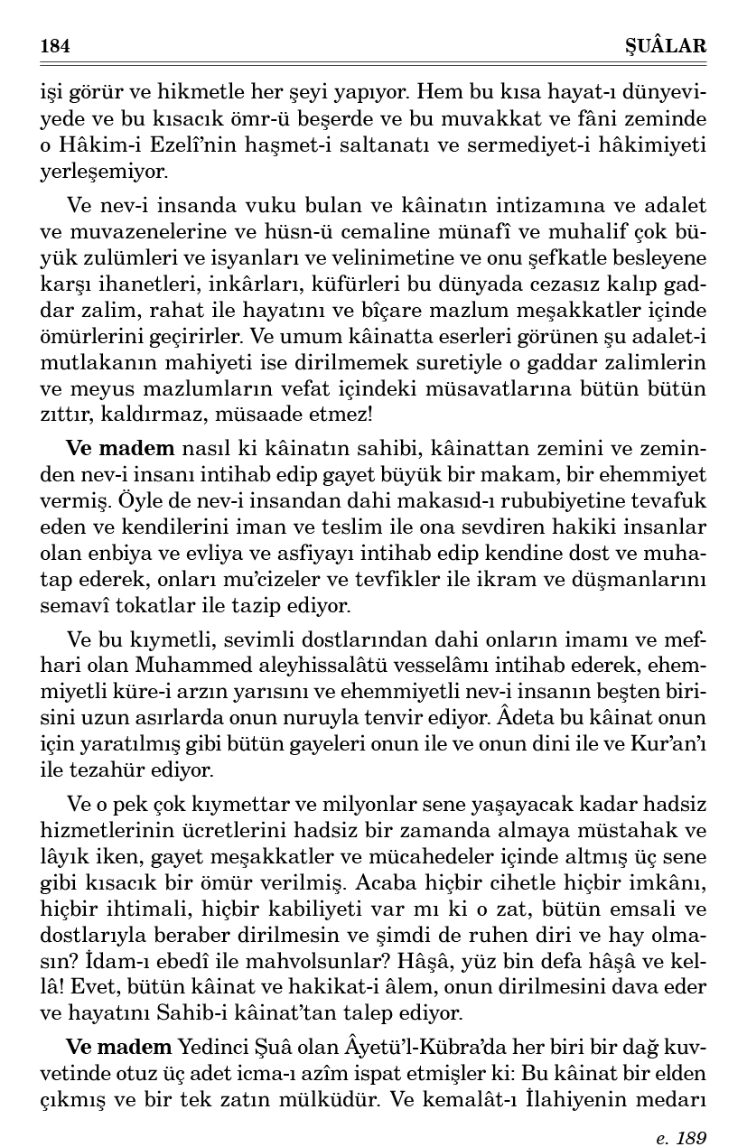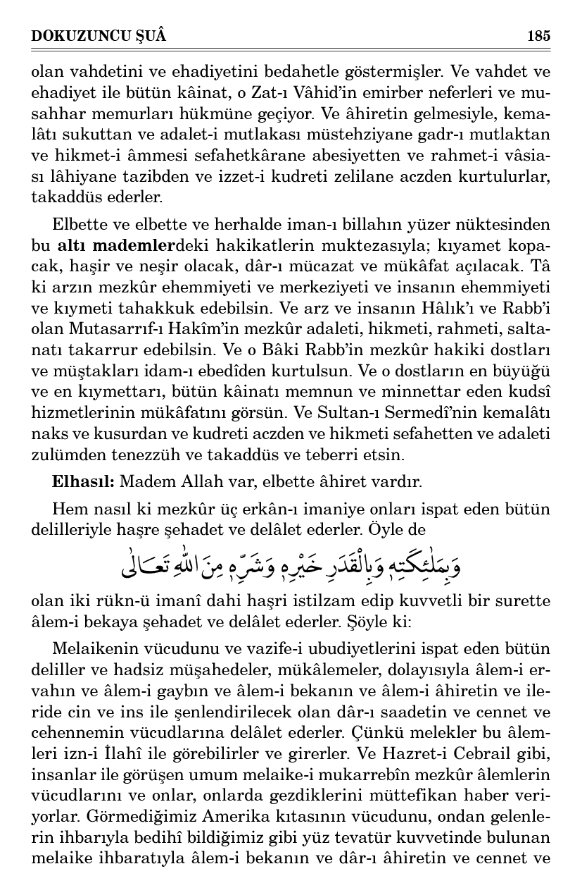 Elbette ve elbette ve herhalde iman-ı billahın yüzer nüktesinden bu altı mademlerdeki hakikatlerin muktezasıyla; kıyamet kopacak, haşir ve neşir olacak, dâr-ı mücazat ve mükâfat açılacak. Tâ ki arzın mezkûr ehemmiyeti ve merkeziyeti ve insanın ehemmiyeti ve kıymeti tahakkuk edebilsin. Ve arz ve insanın Hâlık’ı ve Rabb’i olan Mutasarrıf-ı Hakîm’in mezkûr adaleti, hikmeti, rahmeti, saltanatı takarrur edebilsin. Ve o Bâki Rabb’in mezkûr hakiki dostları ve müştakları idam-ı ebedîden kurtulsun. Ve o dostların en büyüğü ve en kıymettarı, bütün kâinatı memnun ve minnettar eden kudsî hizmetlerinin mükâfatını görsün. Ve Sultan-ı Sermedî’nin kemalâtı naks ve kusurdan ve kudreti aczden ve hikmeti sefahetten ve adaleti zulümden tenezzüh ve takaddüs ve teberri etsin.