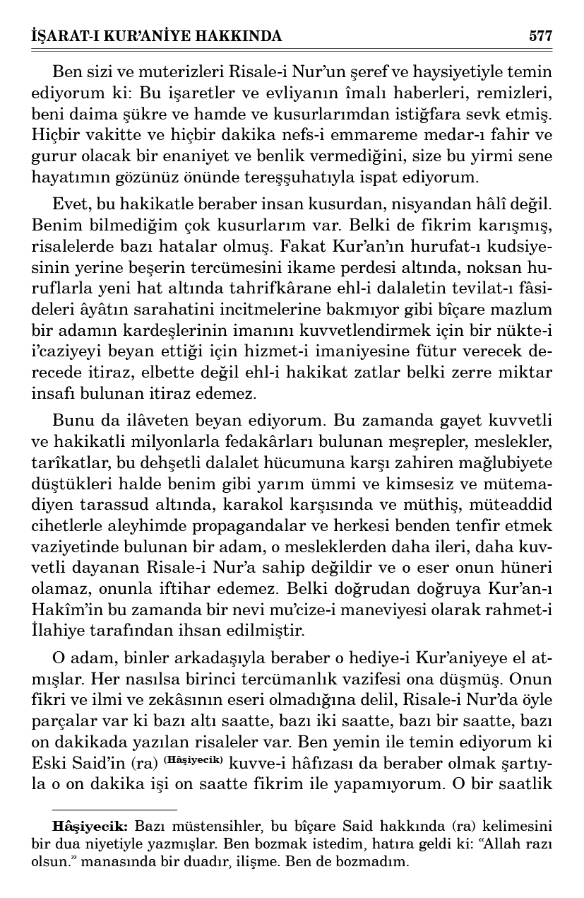 Ben sizi ve muterizleri Risale-i Nur’un şeref ve haysiyetiyle temin ediyorum ki: Bu işaretler ve evliyanın îmalı haberleri, remizleri, beni daima şükre ve hamde ve kusurlarımdan istiğfara sevk etmiş. Hiçbir vakitte ve hiçbir dakika nefs-i emmareme medar-ı fahir ve gurur olacak bir enaniyet ve benlik vermediğini, size bu yirmi sene hayatımın gözünüz önünde tereşşuhatıyla ispat ediyorum.