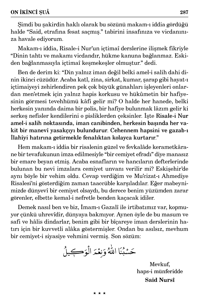 Demek nasıl ben ve biz, İmam-ı Gazalî ile irtibatımız var, kopmuyor çünkü uhrevîdir, dünyaya bakmıyor. Aynen öyle de bu masum ve safi ve hâlis dindarlar, benim gibi bir bîçareye iman derslerinin hatırı için bir kuvvetli alâka göstermişler. Ondan bu asılsız, mevhum bir cemiyet-i siyasiye vehmini vermiş. Son sözüm: