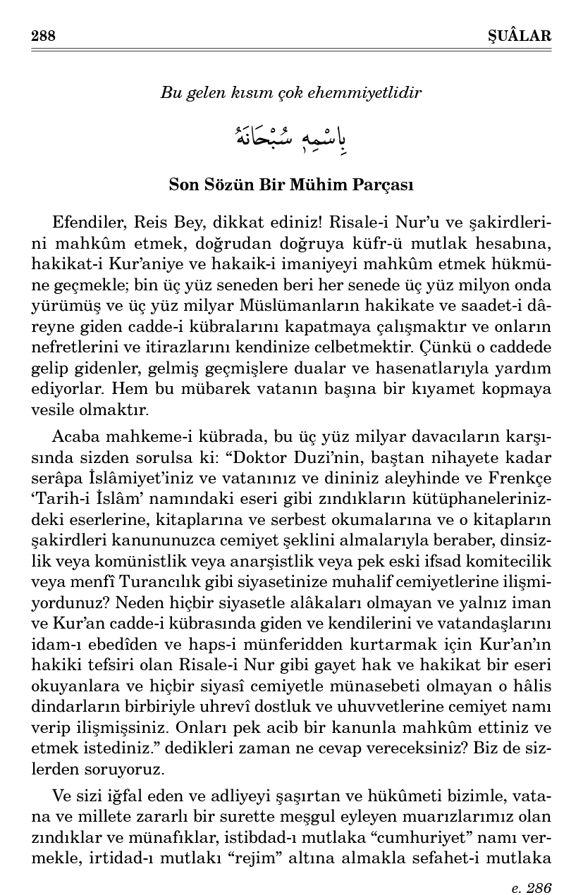 Efendiler! Şimdiki hayat-ı içtimaiyeyi bilemediğimden, makam-ı iddianın gidişatına göre sizce musammem mahkûmiyetimize bir bahane olmak için pek musırrane ileri sürdüğünüz cemiyetçilik ittihamına karşı pek çok kat’î cevaplarımızı Ankara ehl-i vukufunun dahi müttefikan tasdikleriyle beraber, bu derece bu noktada ısrarınıza çok hayret ve taaccübde bulunurken kalbime bu mana geldi: