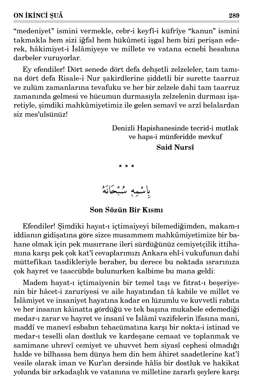 Madem hayat-ı içtimaiyenin bir temel taşı ve fıtrat-ı beşeriyenin bir hâcet-i zaruriyesi ve aile hayatından tâ kabile ve millet ve İslâmiyet ve insaniyet hayatına kadar en lüzumlu ve kuvvetli rabıta ve her insanın kâinatta gördüğü ve tek başına mukabele edemediği medar-ı zarar ve hayret ve insanî ve İslâmî vazifelerin îfasına mani, maddî ve manevî esbabın tehacümatına karşı bir nokta-i istinad ve medar-ı teselli olan dostluk ve kardeşane cemaat ve toplanmak ve samimane uhrevî cemiyet ve uhuvvet hem siyasî cephesi olmadığı halde ve bilhassa hem dünya hem din hem âhiret saadetlerine kat’î vesile olarak iman ve Kur’an dersinde hâlis bir dostluk ve hakikat yolunda bir arkadaşlık ve vatanına ve milletine zararlı şeylere karşı