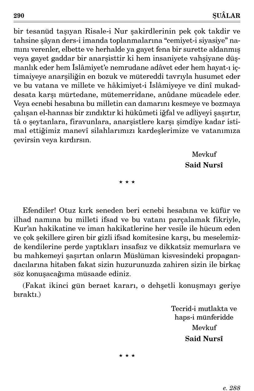 Beraetimizden sonra Denizli’de beni tarassudla taciz edenlere ve büyük âmirlerine ve polis müdürüyle müfettişlere dedim: Risale-i Nur’un kabil-i inkâr olmayan bir kerametidir ki yirmi sene mazlumiyet hayatımda, yüzer risale ve mektublarımda ve binler şakirdlerde hiçbir cereyan, hiçbir cemiyet ile ve dâhilî ve haricî hiçbir komite ile hiçbir vesika, hiçbir alâka, dokuz ay tetkikatta bulunmamasıdır. Hiçbir fikrin ve tedbirin haddi midir ki bu hârika vaziyeti versin. Bir tek adamın birkaç senedeki mahrem esrarı meydana çıksa elbette onu mes’ul ve mahcup edecek yirmi madde bulunacak.