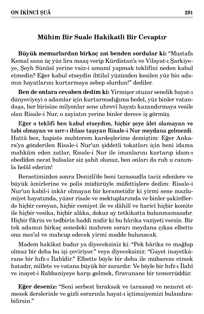 Eğer o teklifi ben kabul etseydim, hiçbir şeye âlet olamayan ve tabi olmayan ve sırr-ı ihlası taşıyan Risale-i Nur meydana gelmezdi. Hattâ ben, hapiste muhterem kardeşlerime demiştim: Eğer Ankara’ya gönderilen Risale-i Nur’un şiddetli tokatları için beni idama mahkûm eden zatlar, Risale-i Nur ile imanlarını kurtarıp idam-ı ebedîden necat bulsalar siz şahit olunuz, ben onları da ruh u canımla helâl ederim!