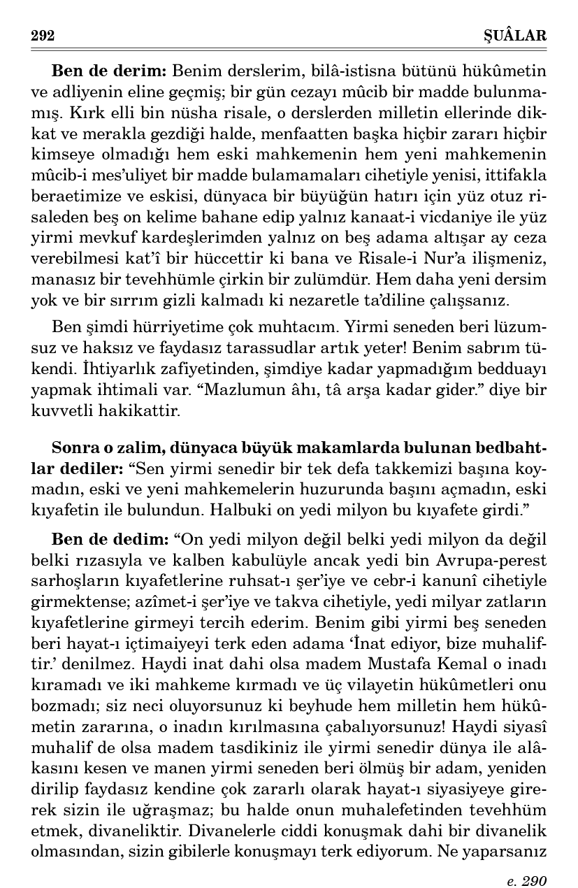 Şimdiki fırtınalı asırda gaddar medeniyetten neş’et eden hodgâmlık ve asabiyet-i unsuriye ve umumî harpten gelen istibdadat-ı askeriye ve dalaletten çıkan merhametsizlik cihetinde öyle bir eşedd-i zulüm ve eşedd-i istibdat meydan almış ki ehl-i hak, hakkını kuvvet-i maddiye ile müdafaa etse ya eşedd-i zulüm ile tarafgirlik bahanesiyle çok bîçareleri yakacak, o halette o da ezlem olacak veyahut mağlup kalacak. Çünkü mezkûr hissiyatla hareket ve taarruz eden insanlar, bir iki adamın hatasıyla yirmi otuz adamı, âdi bahanelerle vurur, perişan eder.