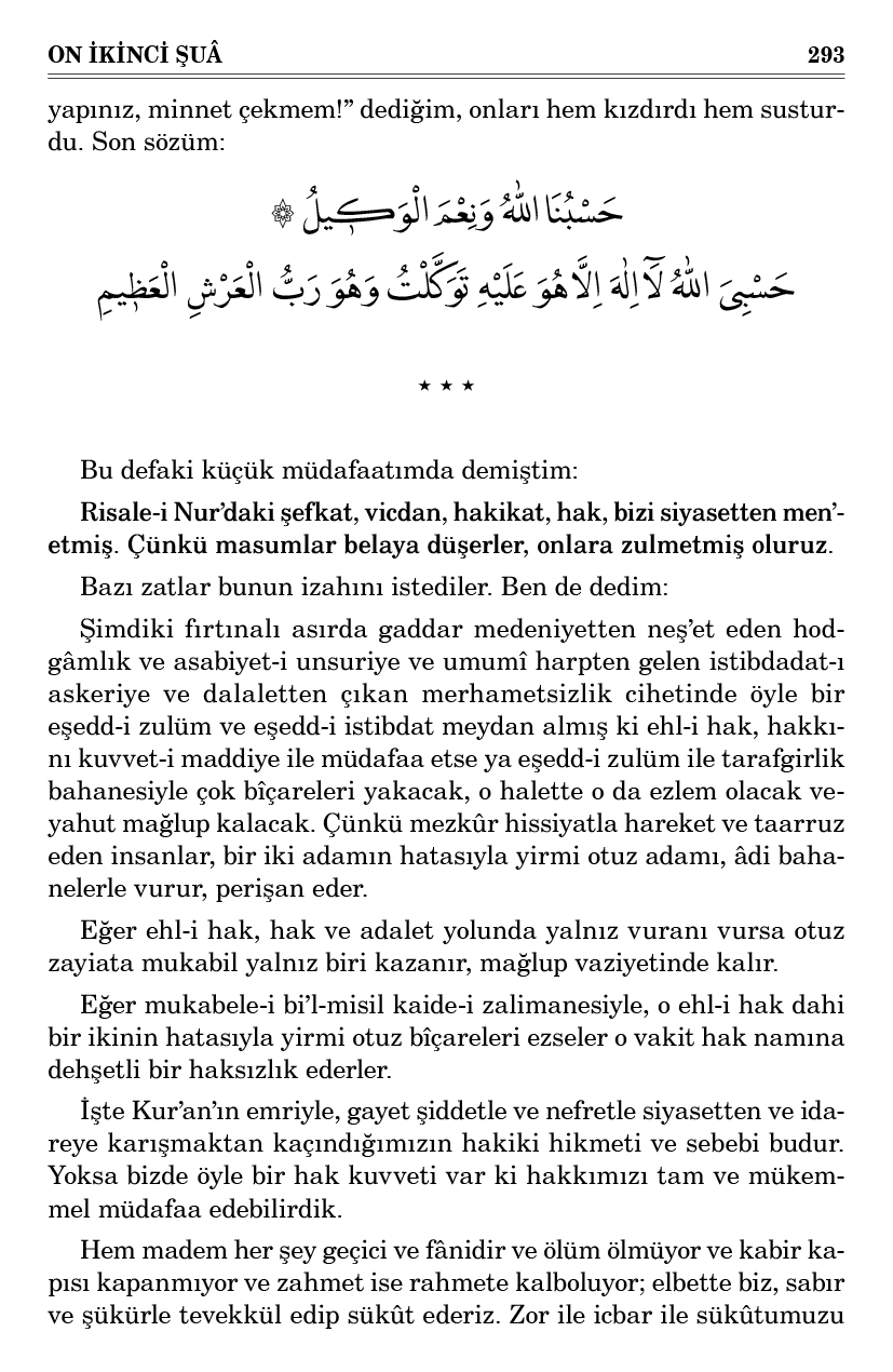 İşte Kur’an’ın emriyle, gayet şiddetle ve nefretle siyasetten ve idareye karışmaktan kaçındığımızın hakiki hikmeti ve sebebi budur. Yoksa bizde öyle bir hak kuvveti var ki hakkımızı tam ve mükemmel müdafaa edebilirdik.