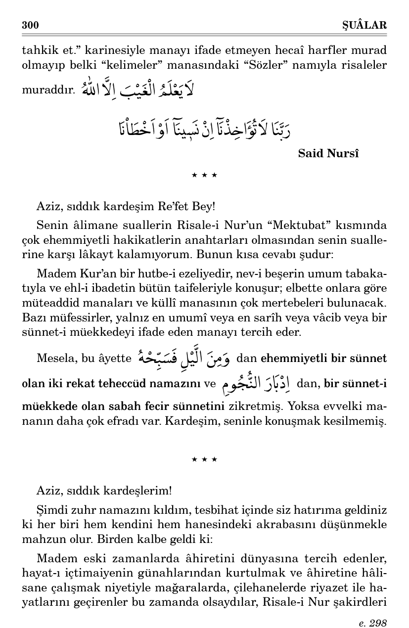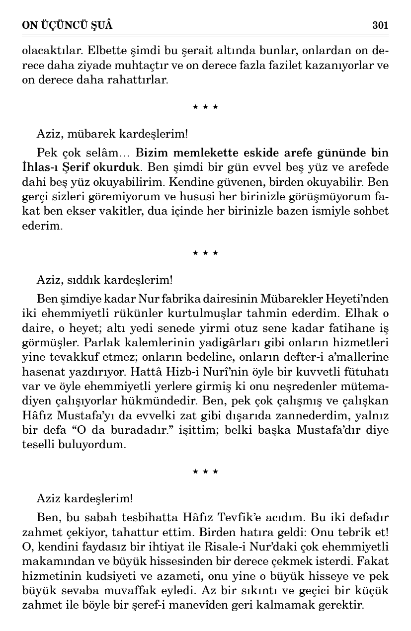 Ben şimdiye kadar Nur fabrika dairesinin Mübarekler Heyeti’nden iki ehemmiyetli rükünler kurtulmuşlar tahmin ederdim. Elhak o daire, o heyet; altı yedi senede yirmi otuz sene kadar fatihane iş görmüşler. Parlak kalemlerinin yadigârları gibi onların hizmetleri yine tevakkuf etmez; onların bedeline, onların defter-i a’mallerine hasenat yazdırıyor. Hattâ Hizb-i Nurî’nin öyle bir kuvvetli fütuhatı var ve öyle ehemmiyetli yerlere girmiş ki onu neşredenler mütemadiyen çalışıyorlar hükmündedir. Ben, pek çok çalışmış ve çalışkan Hâfız Mustafa’yı da evvelki zat gibi dışarıda zannederdim, yalnız bir defa “O da buradadır.” işittim; belki başka Mustafa’dır diye teselli buluyordum.