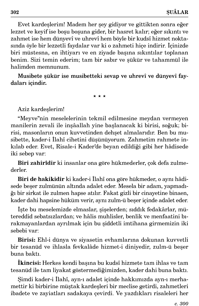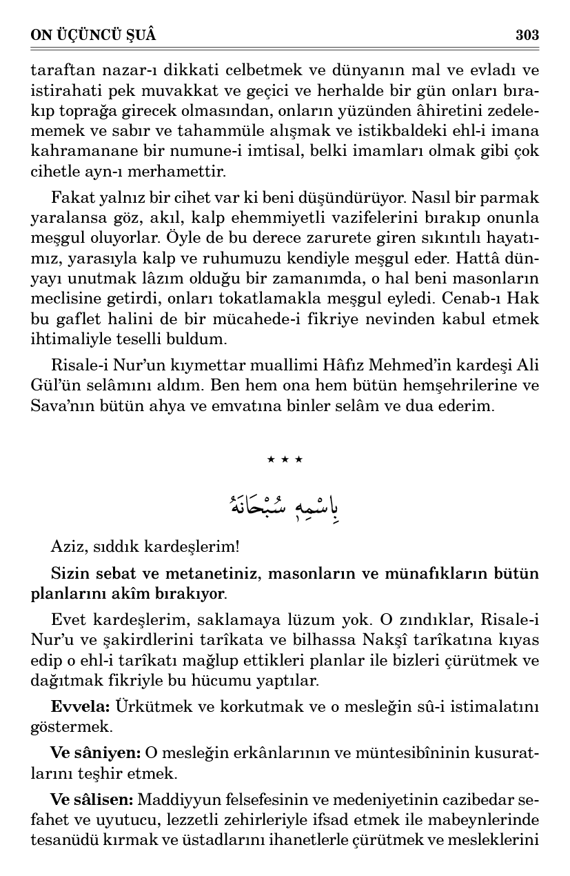 Fakat yalnız bir cihet var ki beni düşündürüyor. Nasıl bir parmak yaralansa göz, akıl, kalp ehemmiyetli vazifelerini bırakıp onunla meşgul oluyorlar. Öyle de bu derece zarurete giren sıkıntılı hayatımız, yarasıyla kalp ve ruhumuzu kendiyle meşgul eder. Hattâ dünyayı unutmak lâzım olduğu bir zamanımda, o hal beni masonların meclisine getirdi, onları tokatlamakla meşgul eyledi. Cenab-ı Hak bu gaflet halini de bir mücahede-i fikriye nevinden kabul etmek ihtimaliyle teselli buldum.