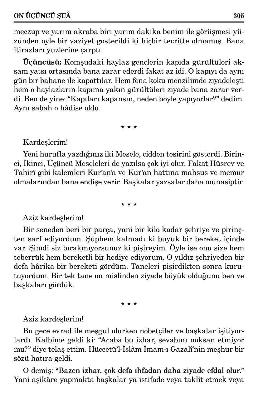 Bu gece evrad ile meşgul olurken nöbetçiler ve başkalar işitiyorlardı. Kalbime geldi ki: “Acaba bu izhar, sevabını noksan etmiyor mu?” diye telaş ettim. Hüccetü’l-İslâm İmam-ı Gazalî’nin meşhur bir sözü hatıra geldi.